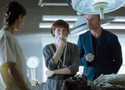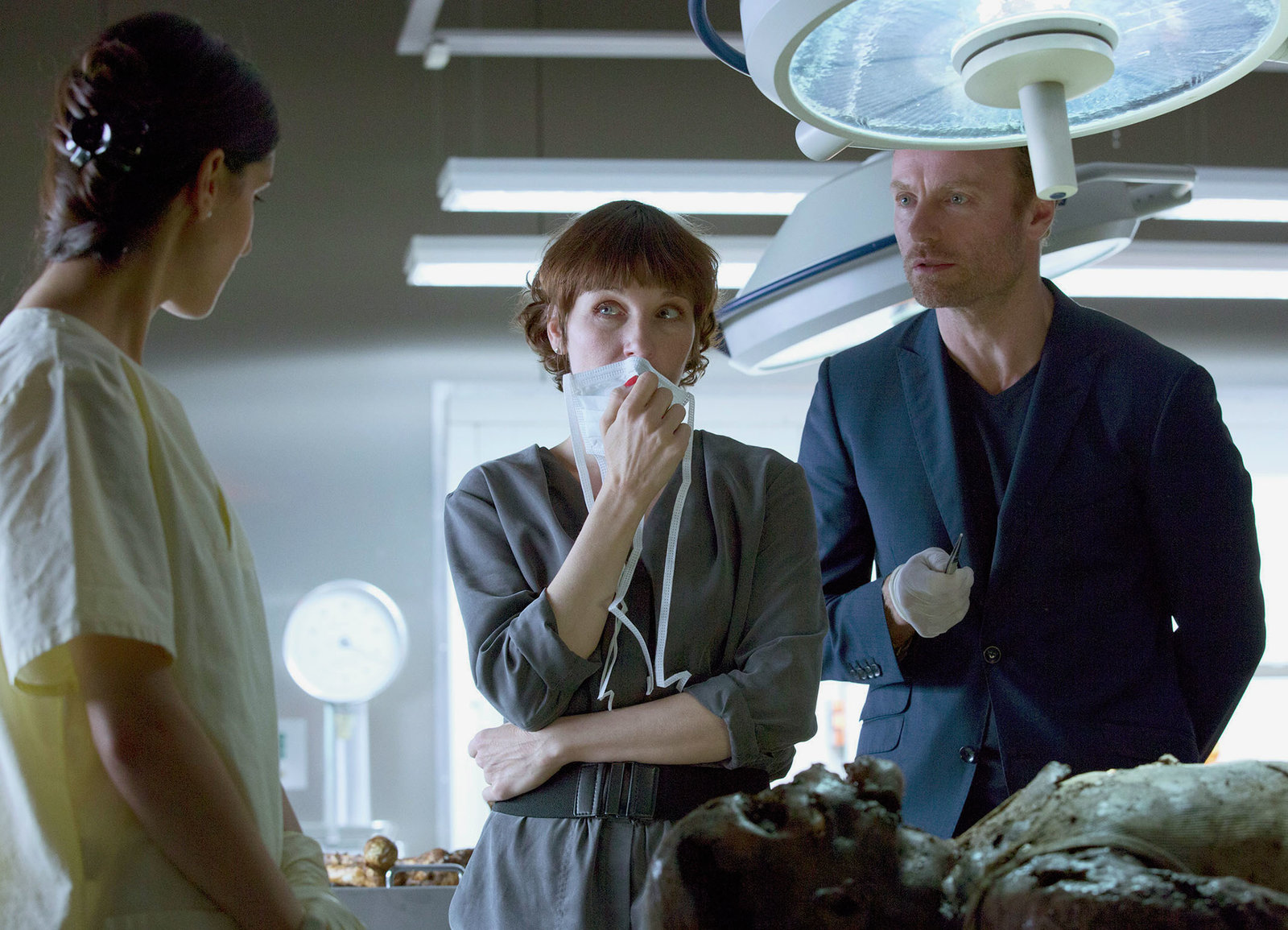 ÄtzendDie Pathologin informiert die Kriminalbeamten über den Zustand der Leiche: Maryam Zaree als Nasrin Reza, Meret Becker als Kriminalhauptkommissarin Nina Rubin, Mark Waschke als Kriminalhauptkommissar Robert KarowBild: © SRF/rbb/Volker Roloff