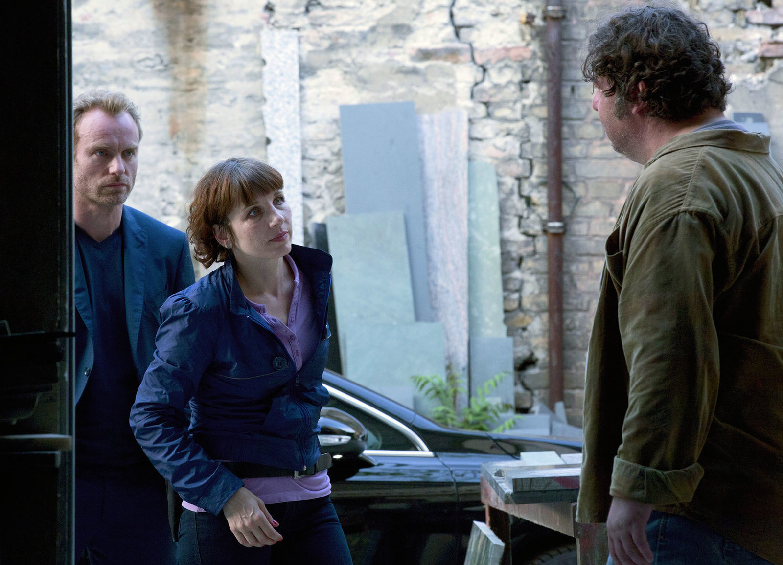 ÄtzendSie überprüfen eine alte Aussage: Mark Waschke als Kriminalhauptkommissar Robert Karow, Meret Becker als Kriminalhauptkommissarin Nina Rubin, Rainer Piwek als Tim BaumgartnerBild: © SRF/rbb/Volker Roloff