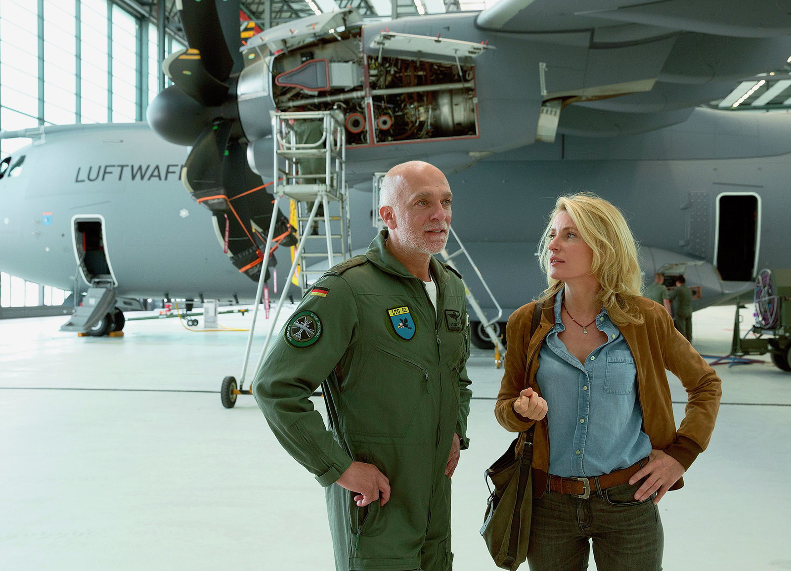 SpielverderberIm Hangar: Richard van Weyden als Oberst Andreas Friedrichs, Maria Furtwängler als Hauptkommissarin Charlotte LindholmBild: © SRF/NDR/Frederic Batier