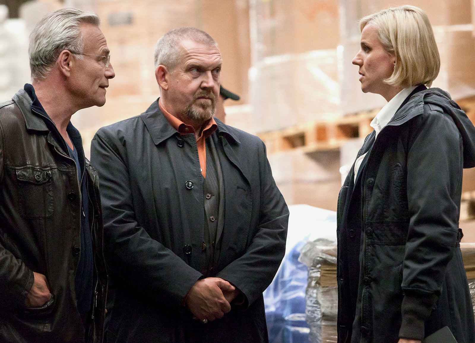 BenutztErmitteln in einem komplexen Fall: Klaus J. Behrendt als Kriminalhauptkommissar Max Ballauf, Dietmar Bär als Hauptkommissar Freddy Schenk, Winnie Böwe als Kathrin BrandtBild: © SRF/WDR/Thomas Kost