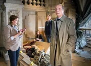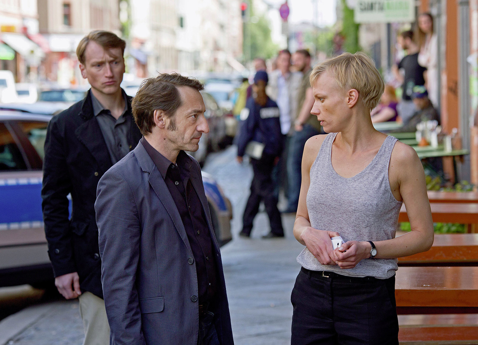 VielleichtDie Polizisten erkundigen sich nach ihrem Befinden: Christian Sengewald als Malte, Boris Aljinovic als Kommissar Stark, Lise Risom Olsen als TrudesBild: © SRF/rbb/Frédéric Batier