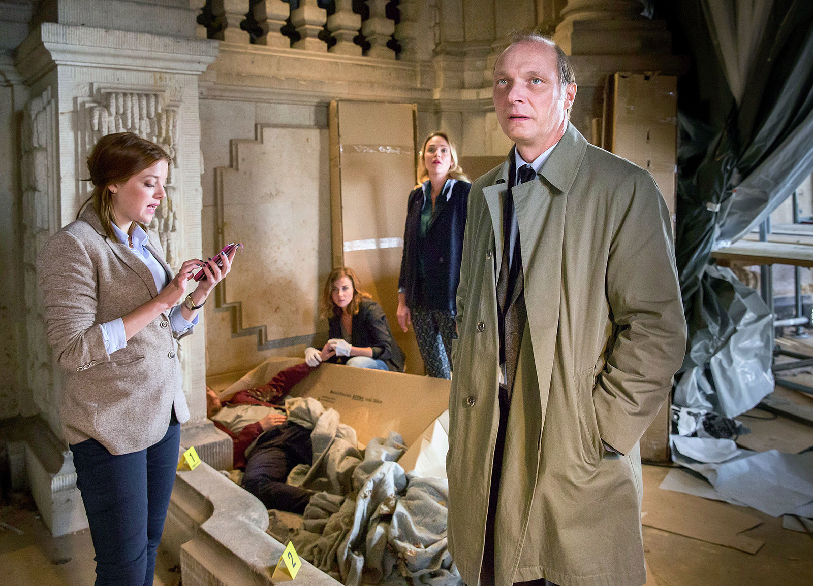 Auf einen SchlagErste Bestandesaufnahme am Tatort: Jella Haase als Kommissarsanwärterin Maria Mohr, Karin Hanczewski als Kommissarin Karin Gorniak, Alwara Höfels als Kommissarin Henni Sieland, Martin Brambach als Kommissar Peter Michael SchnabelBild: © Copyright SRF/MDR/Andreas Wünschirs