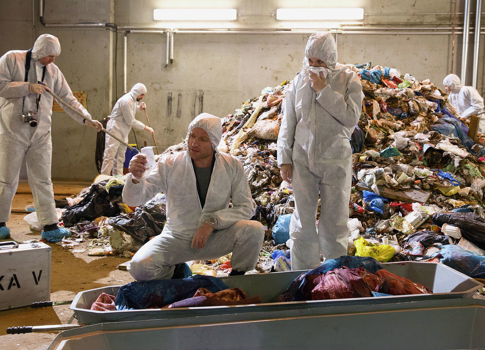 Das MuliLeichenfund auf der Müllhalde: Mark Waschke als Kommissar Robert Karow (vorne l.), Meret Becker als Kommissarin Nina Rubin (vorne r.)Bild: © SRF/rbb/Frédéric Batier