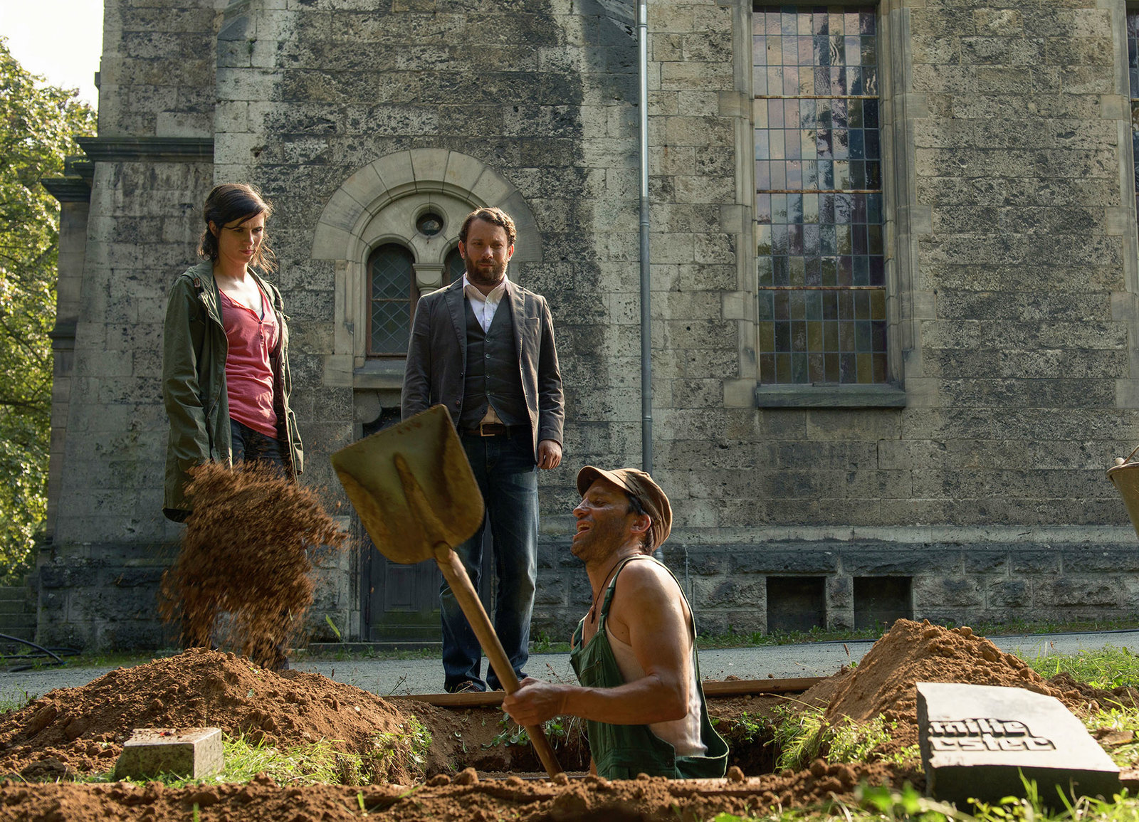 Der treue RoyEiner der Verdächtigen ist Totengräber: Nora Tschirner als Kriminalhauptkommissarin Kira Dorn, Christian Ulmen als Kriminalhauptkommissar Lessing, Thomas Wodianka als Karsten «Flamingo» SchöllerBild: © SRF/MDR/Anke Neugebauer
