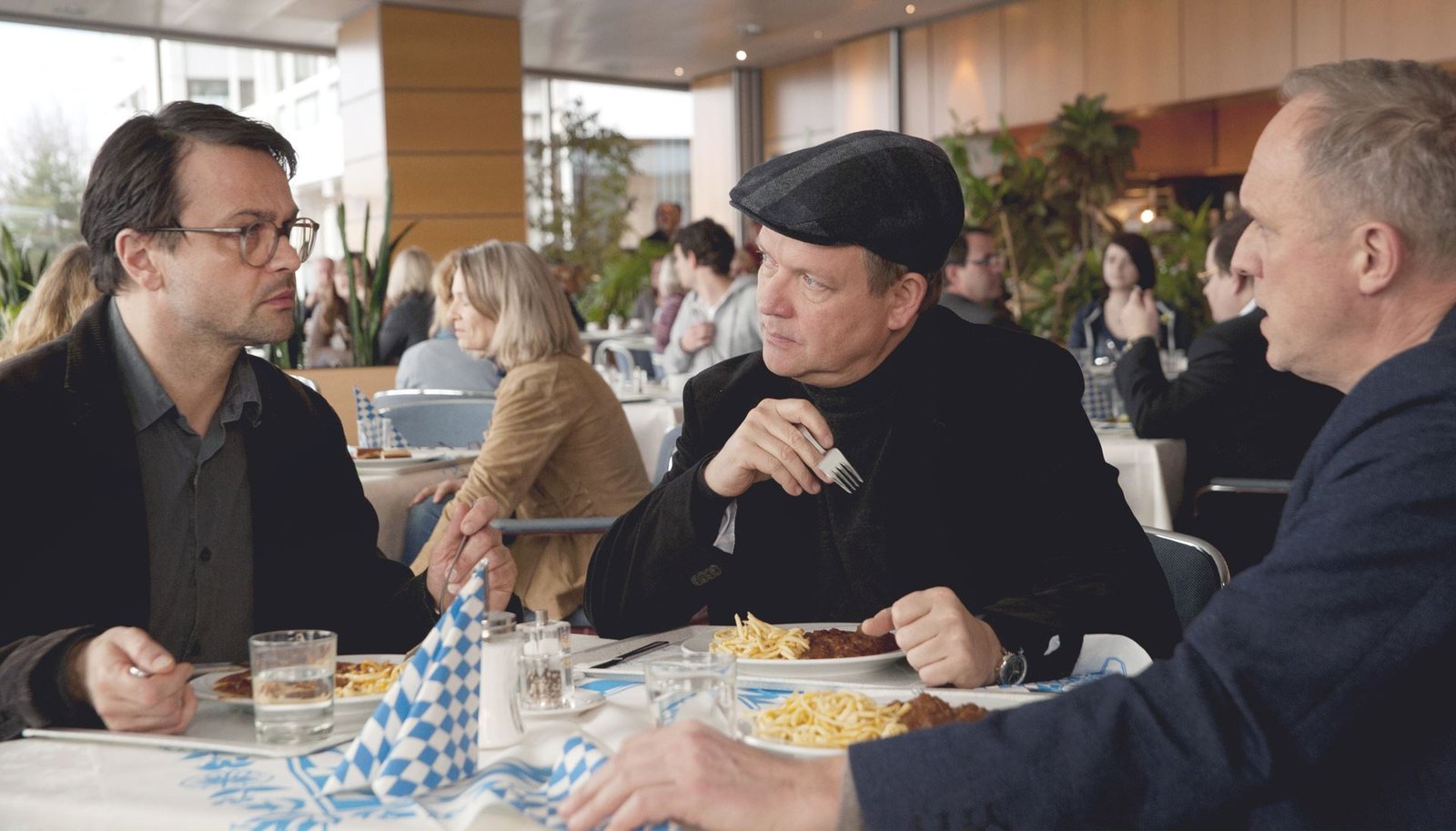 Wer bin ich?v.l.n.r.: Redakteur Hochstätt (Michael Rotschopf), Regisseur Konrad (Justus von Dohnányi) und Ulrich Tukur als er selbst.Bild: © 3sat
