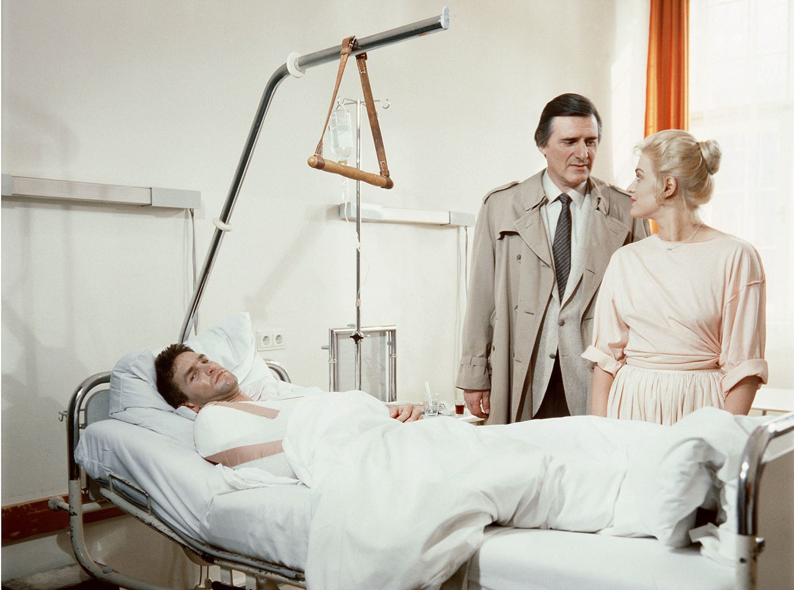 Heißer SchneeWDR Fernsehen TATORT, "Heisser Schnee", Regie Wilma Kottusch, am Mittwoch (19.03.14) um 22:15 Uhr. Kriminalkommissar Lenz (Helmut Fischer) mit Petty (Brigitte Obermeier) am Krankenbett des durch eine Kugel schwerverletzten Burt Baxter (William Mang).Bild: © WDR/BR