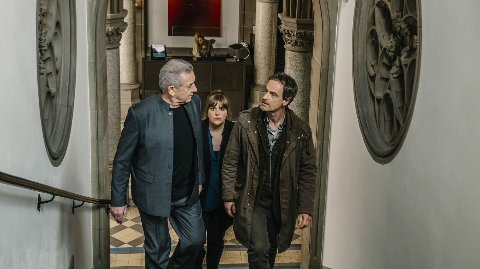 Gier und AngstKommisarin Rosa Herzog (Stefanie Reinsperger, Mitte) und Kommissar Peter Faber (Jörg Hartmann, rechts) begleiten Dr. Artur Mehring (André Jung, links), den Chef des altehrwürdigen Bankhauses "Roden" in dessen Büro.Bild: © WDR/unafilm GmbH/Elliott Kreyenberg