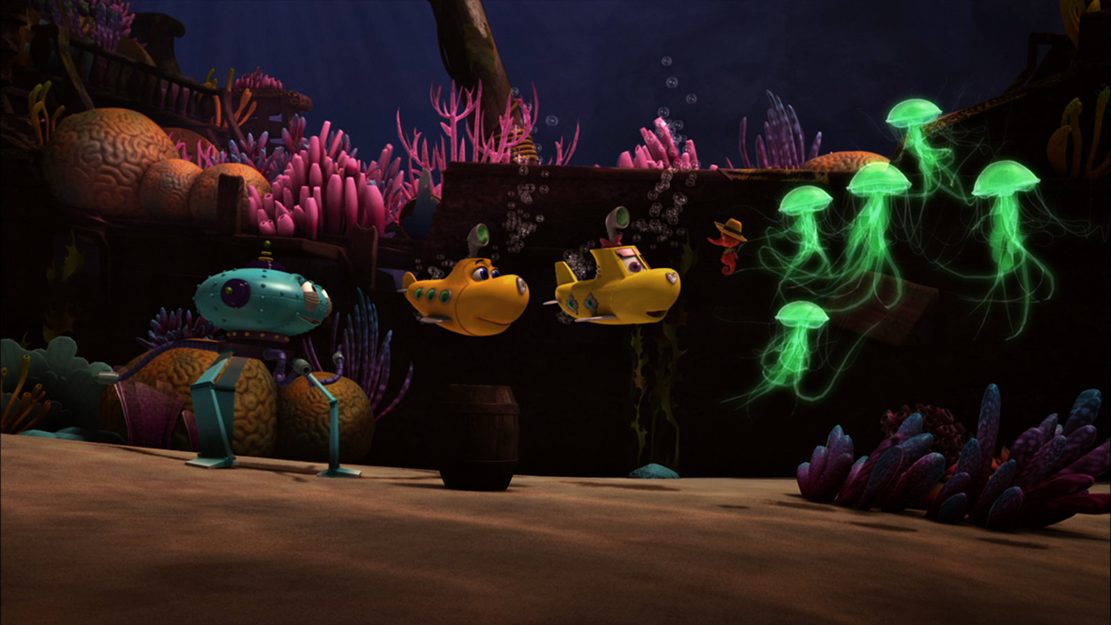 Der Wrack-PlündererTimmy, Bess und UMA setzen als Alarmanlage Quallen ein, die zu leuchten beginnen, sobald sich ihnen jemand nähert.Bild: © KiKA/Mike Young Productions