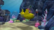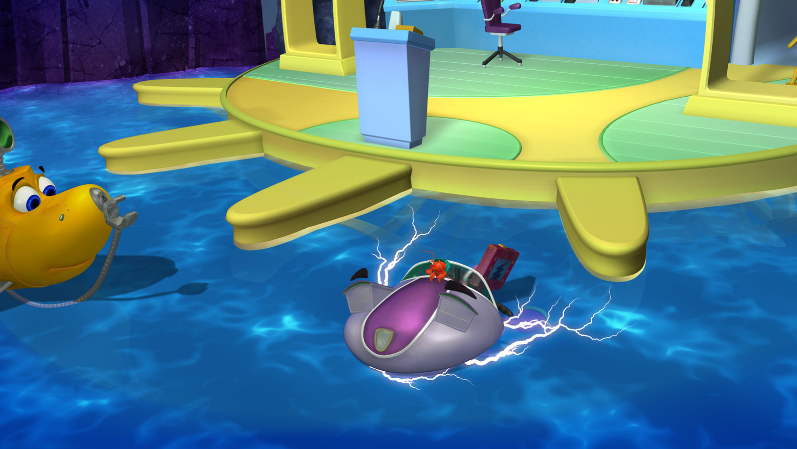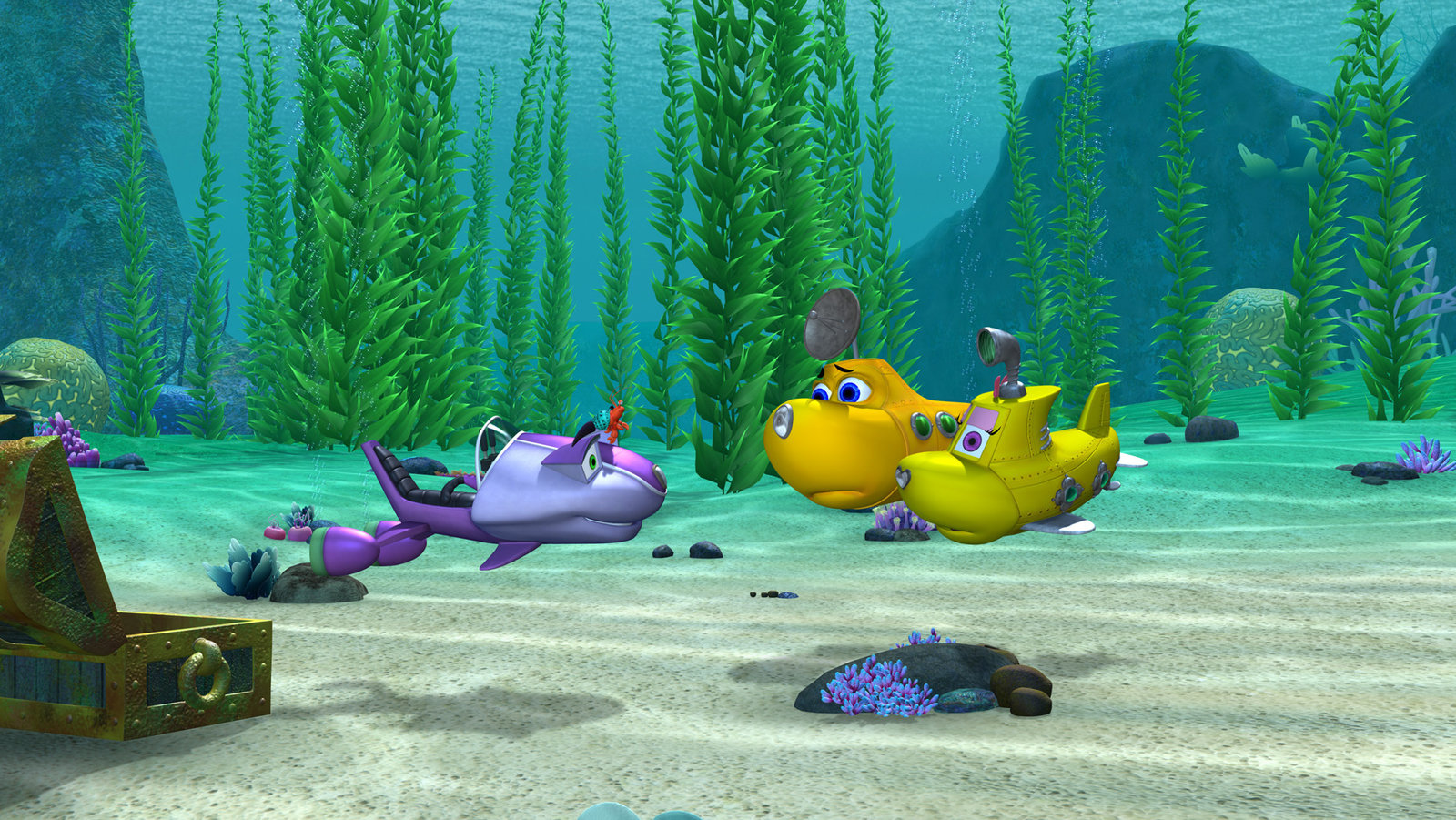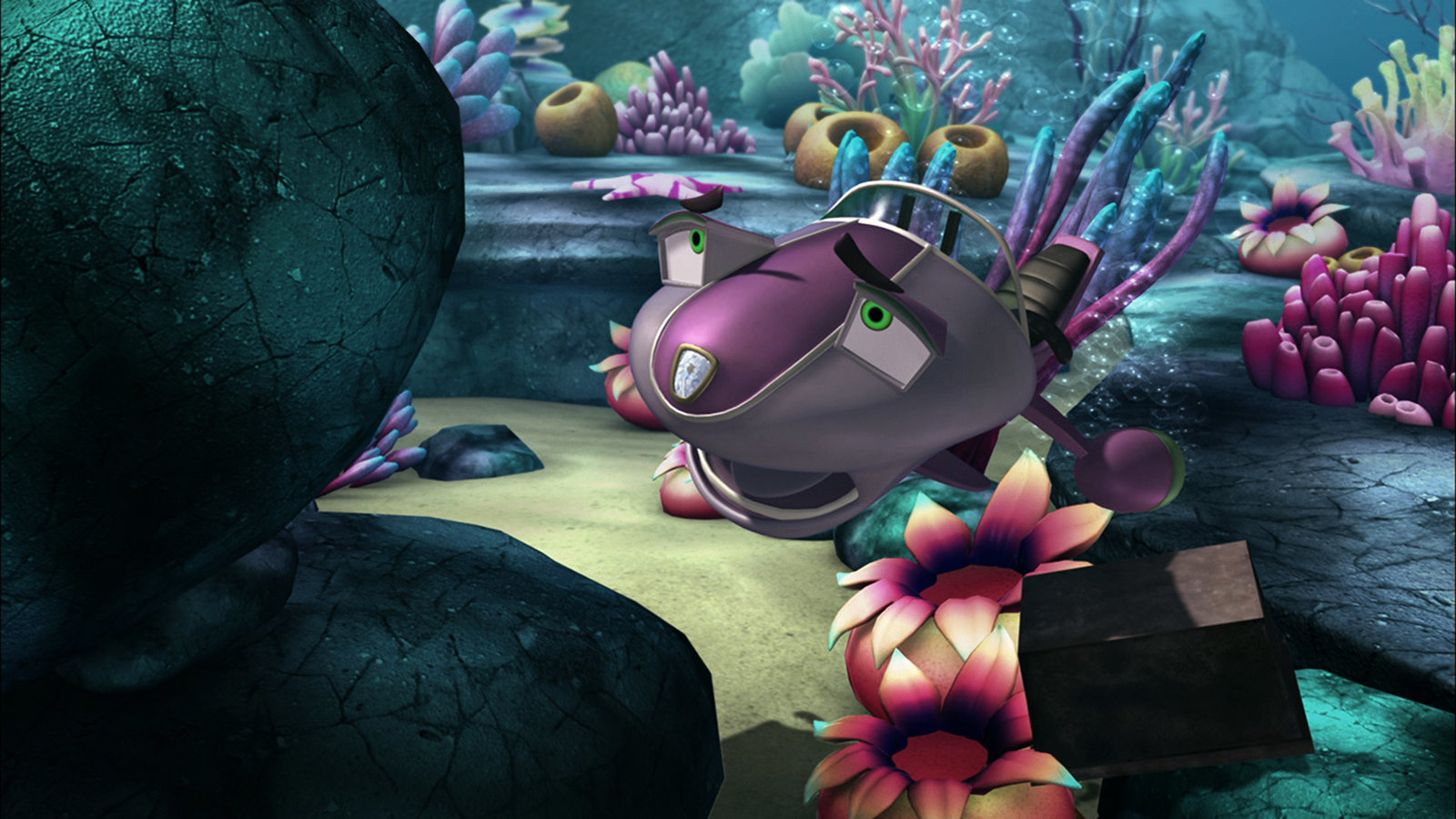 Uma auf AbwegenTimmy und UMA berichten dem roten U-Boot D von einem Abflussrohr, durch das im Seetangwald illegal Klärschlamm abgelassen wurde.Bild: © KiKA/Mike Young Productions