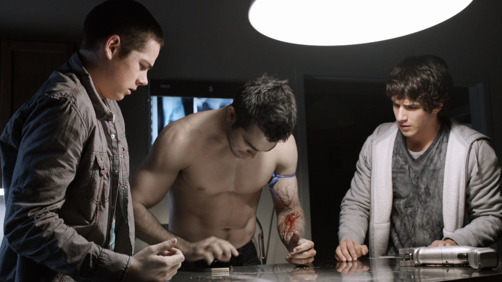Die magische KugelDie Wunde von Derek (Tyler Hoechlin, Mitte) beginnt zu heilen nachdem ihm Scott (Tyler Posey, re) die Kugel gebracht hat...Bild: © RTL II