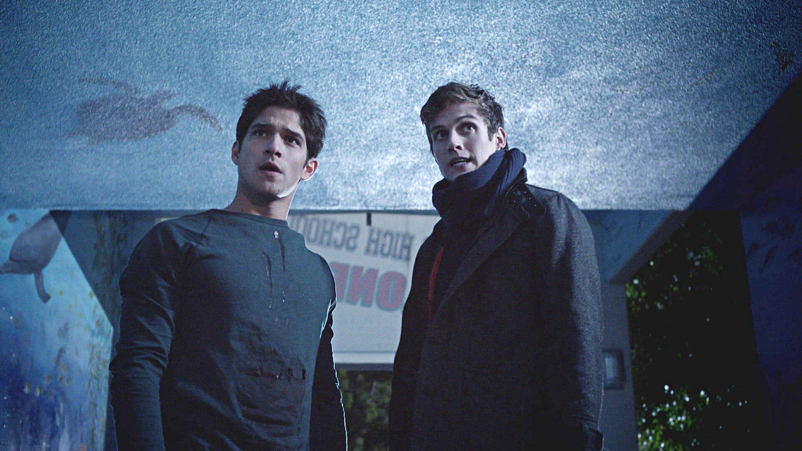 Die Nacht in der HighschoolStiles (Dylan O`Brien, li.) und Scott (Tyler Posey, re.) versuchen sich in der Highscholl vor dem Alpha zu verstecken...Bild: © RTL II