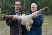 Mammuts - Stars der EiszeitMammut-Experte Dick Mol und Yukon Paläontologe Dr. Grant Zazula mit dem Schädel eines eiszeitlichen Steppenwisents aus einer Goldmine bei Dawson City am Yukon in NordwestkanadaBild: © Florian Breier / © Florian Breier