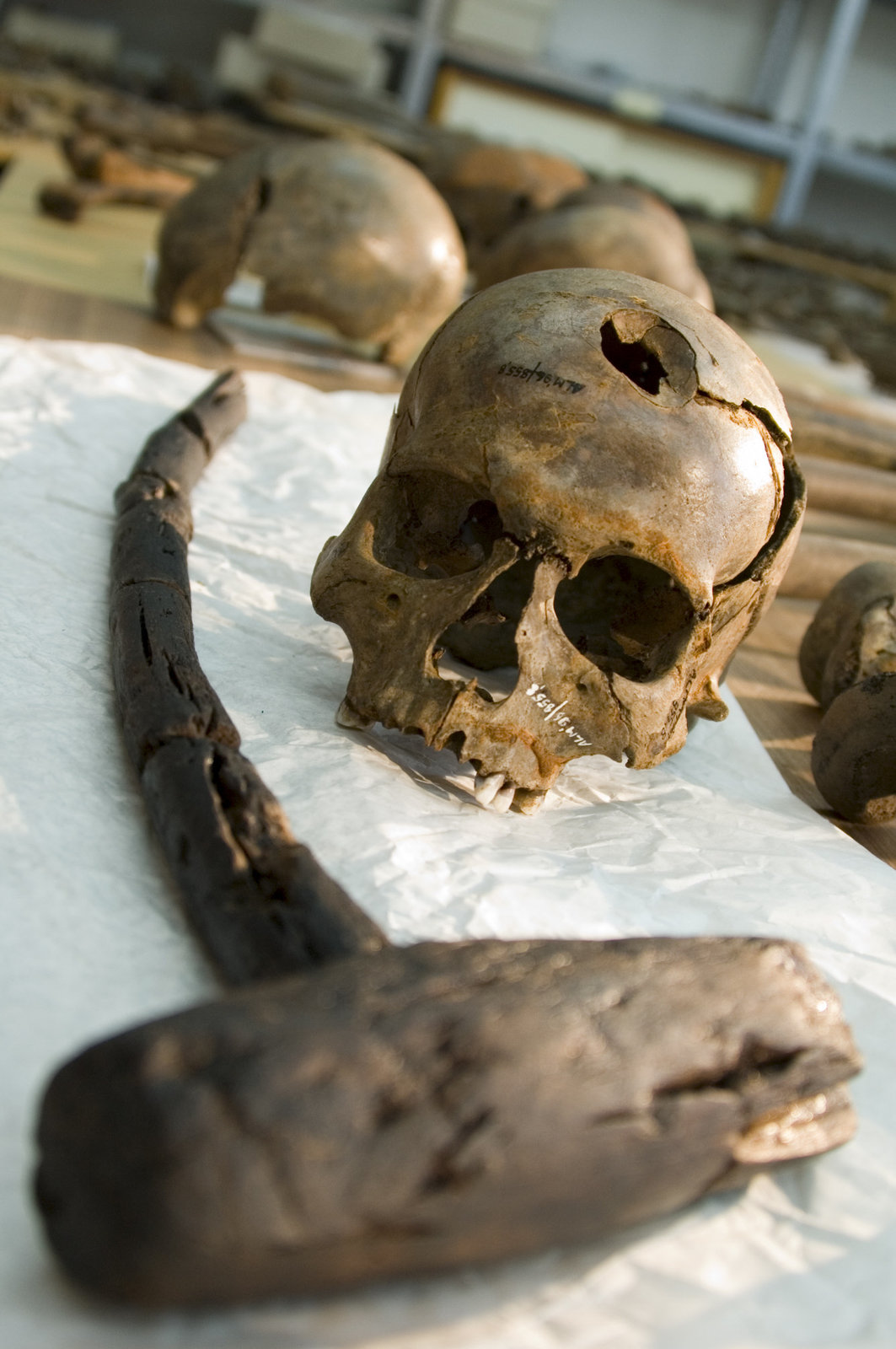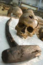 Die Bernsteinstraße - Die dunkle KarawaneWaffe und Opfer der Kämpfe im Tollense-Tal: Ein Holzhammer mit langem Stil wurde zur tödlichen Waffe. Der Schädel wurde mit einem einzigen Schlag verletzt.Bild: © ZDF und Stephan Zengerle