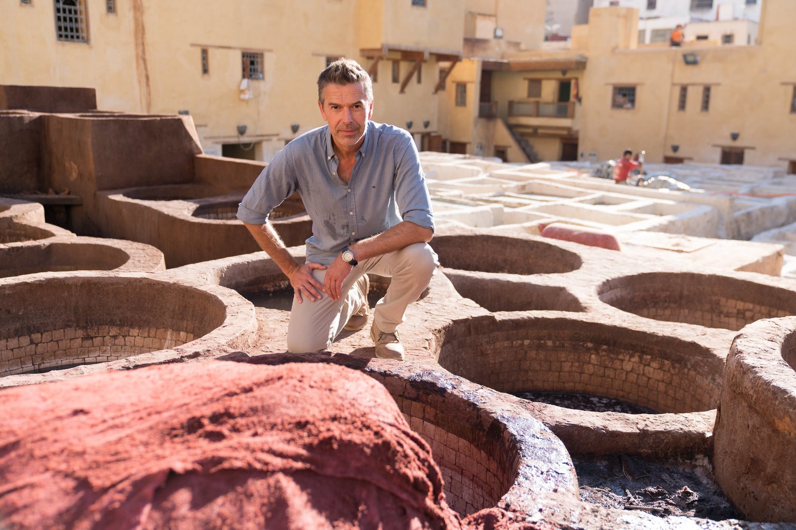 Faszination Erde: 80. Sahara - Schätze im SandmeerDirk Steffens auf der Spur des Transsahara-Handels: "Die Gerberei ist eine Goldmine", heißt es im marokkanischen Fès. Hier stinkt es schon seit dem 11. Jahrhundert nach Tierhäuten im sauren Taubenkot-Bad. Dirk Steffens erkundet, wie der Transsahara-Handel dazu führte, dass die Stadt im 13. Jahrhundert für ihren Reichtum bis nach Europa berühmt war.Bild: © ZDF und Oliver Roetz