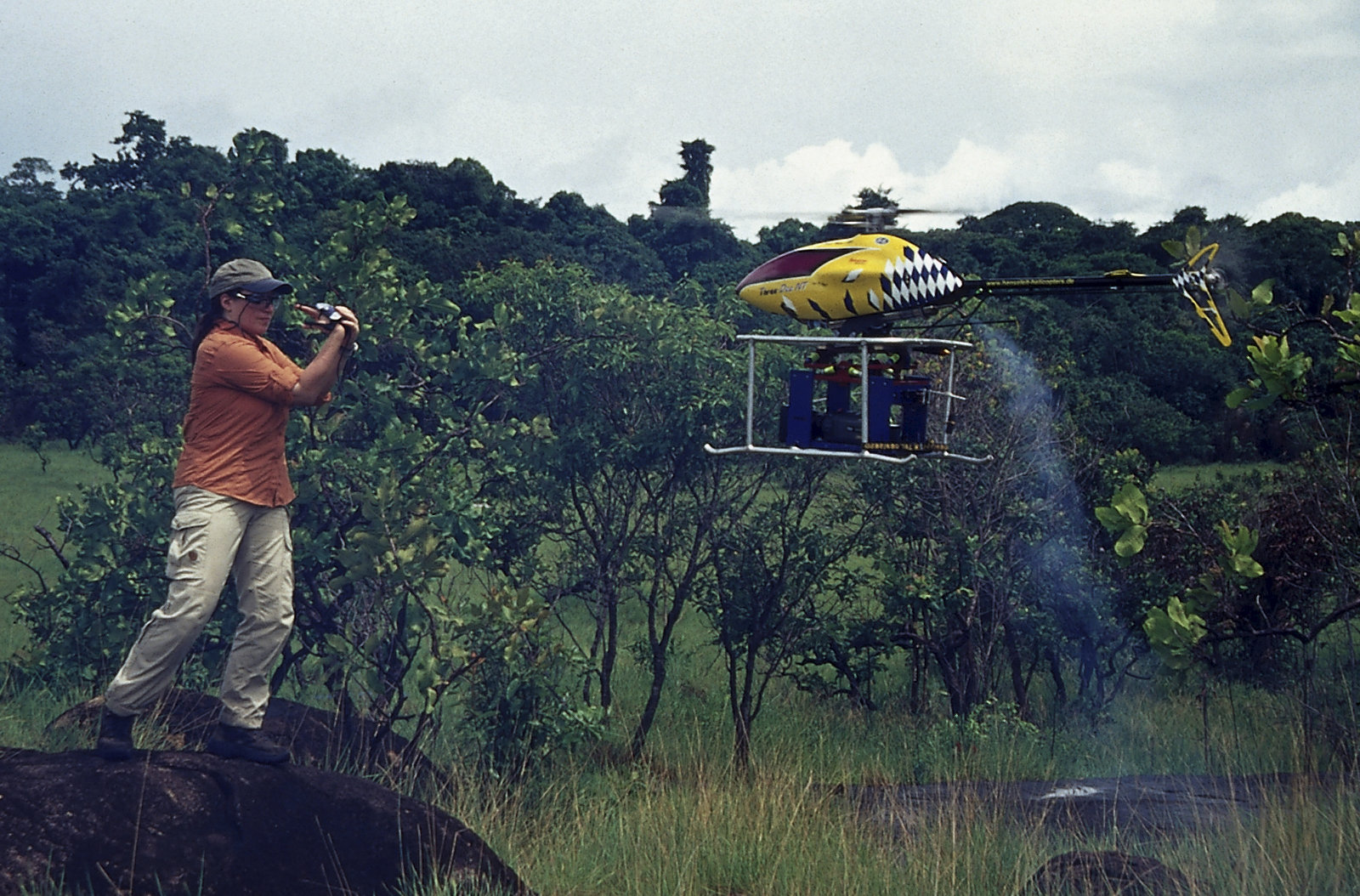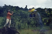 Adventure X: 1. Anaconda Wanted - Auf der Suche nach der RiesenschlangeAutorin Marion Pöllmann mit einer "Drohne" - einem ferngesteuerten Hubschrauber, der eine Kamera trägt.Bild: © ZDF und Michael Allicock