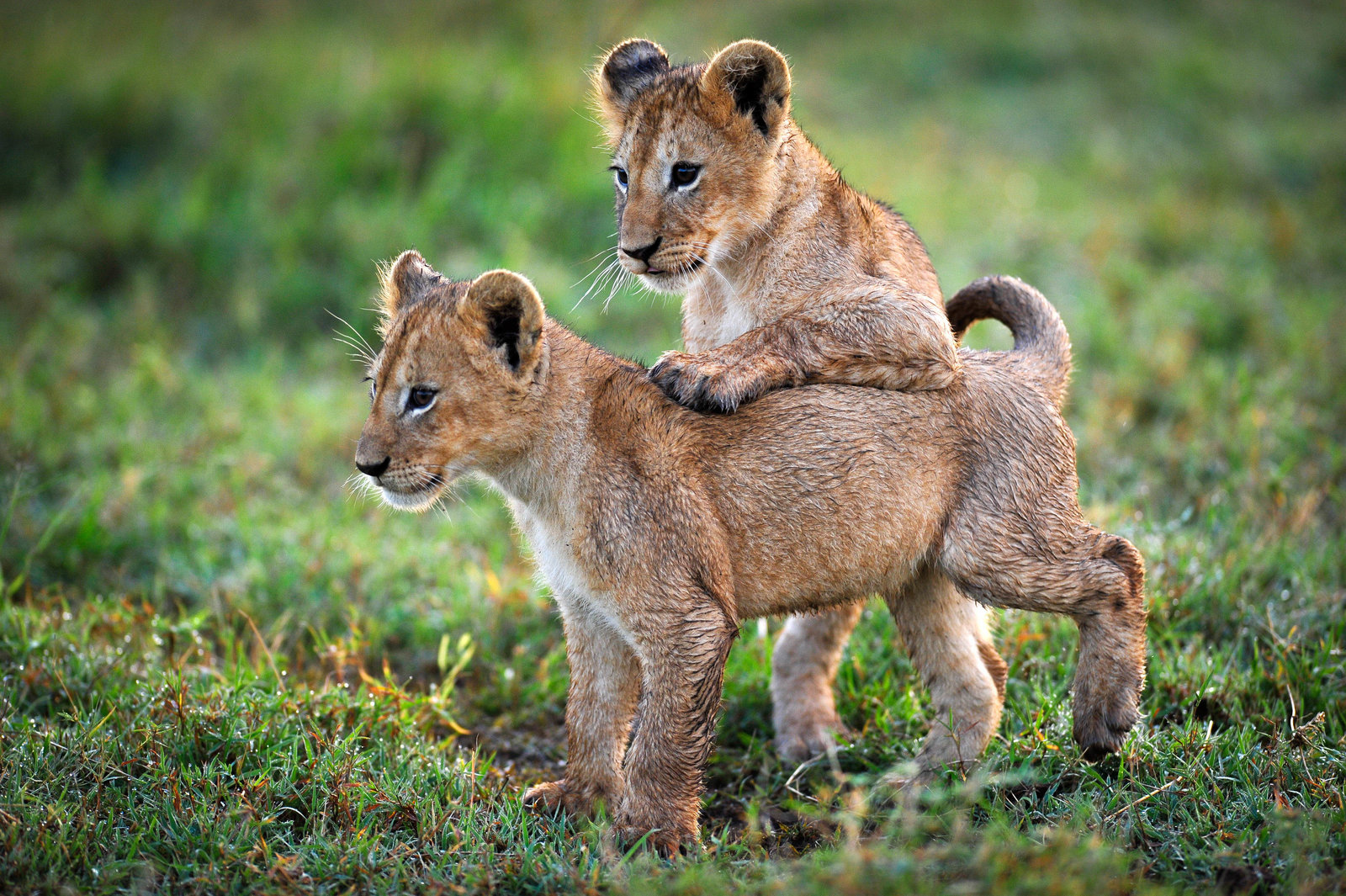 Eine Erde - viele Welten: 5. GraslandZwei kleine Löwenbabys, zehn Wochen alt, im Okavango Delta. Sie müssen ihrer Mutter ins Wasser folgen, denn wenn das Grasland überflutet ist, müssen die Kleinen dort jagen lernen.Bild: © ZDF und Tom Hugh-Jones