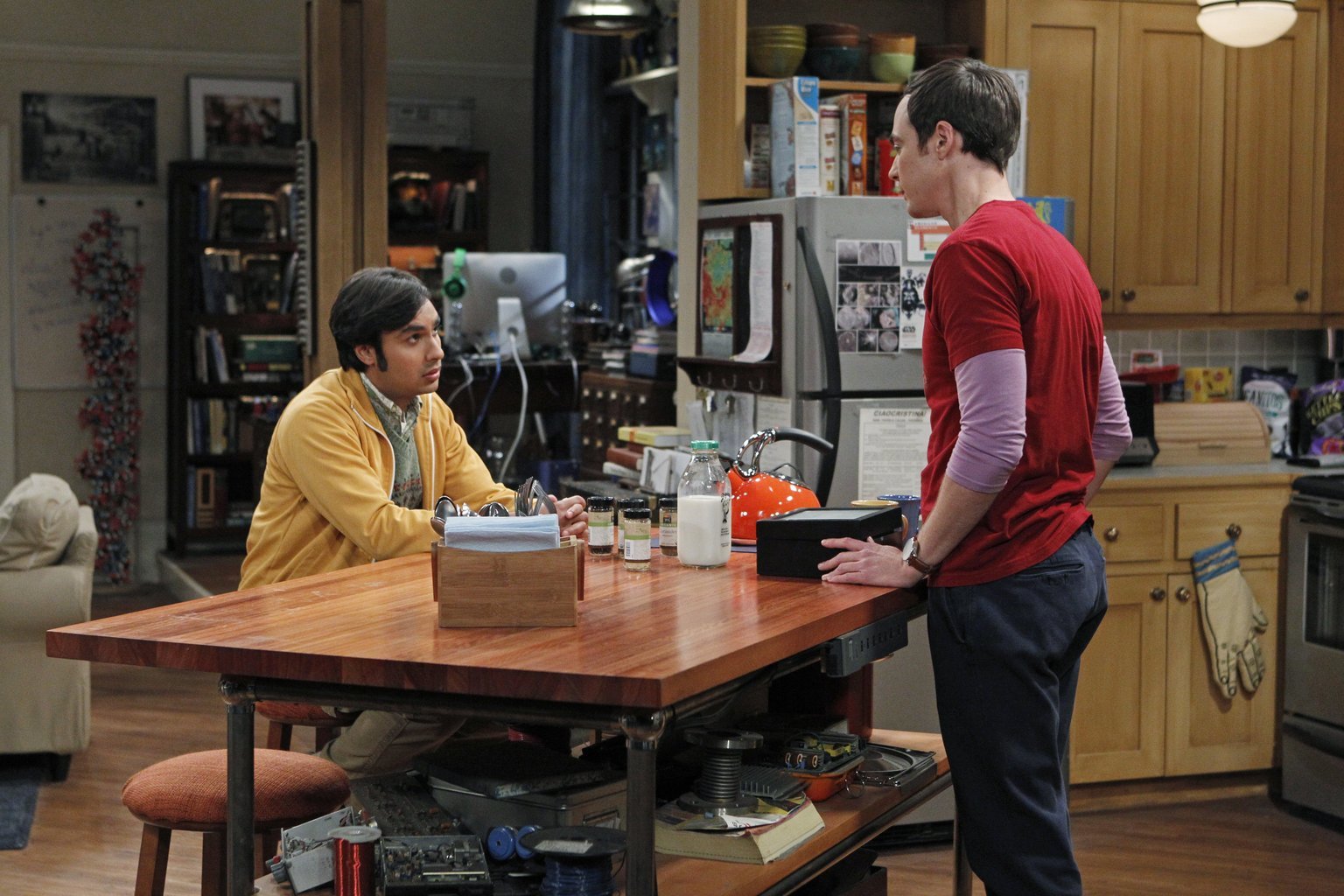 Irgendwie verlobtWährend Howard und Bernadette Mrs. Wolowitz pflegen, bekommt Raj (Kunal Nayyar, l.) ganz besondere Beziehungstipps von Sheldon (Jim Parsons, r.) ...Bild: © Warner Brothers Lizenzbild frei