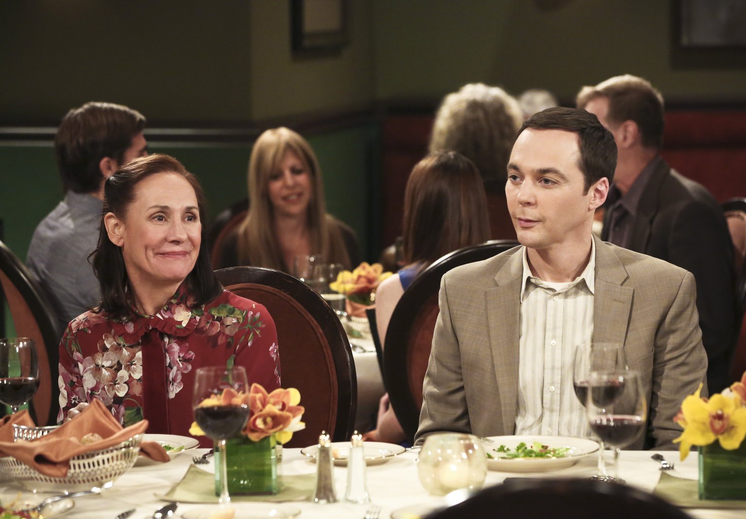 Die Annäherungs-VersuchungSheldons (Jim Parsons, r.) Mutter Mary (Laurie Metcalf, l.) freut sich sehr darüber, dass Leonard und Penny sie bei ihrer zweiten Hochzeit dabei haben wollen. Doch Leonards Mutter Beverly macht es ihr und den anderen schwer, die Feier zu genießen ...Bild: © 2016 Warner Brothers Lizenzbild frei
