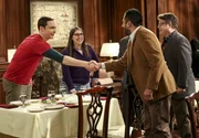 Der Nobelpreis-DiebstahlsversuchL-R: Sheldon Cooper (Jim Parsons), Amy Farrah Fowler (Mayim Bialik), Dr. Campbell (Kal Penn), Dr. Pemberton (Sean Astin).Bild: © 2018 WBEI. All rights reserved. / Michael Yarish Lizenzbild frei