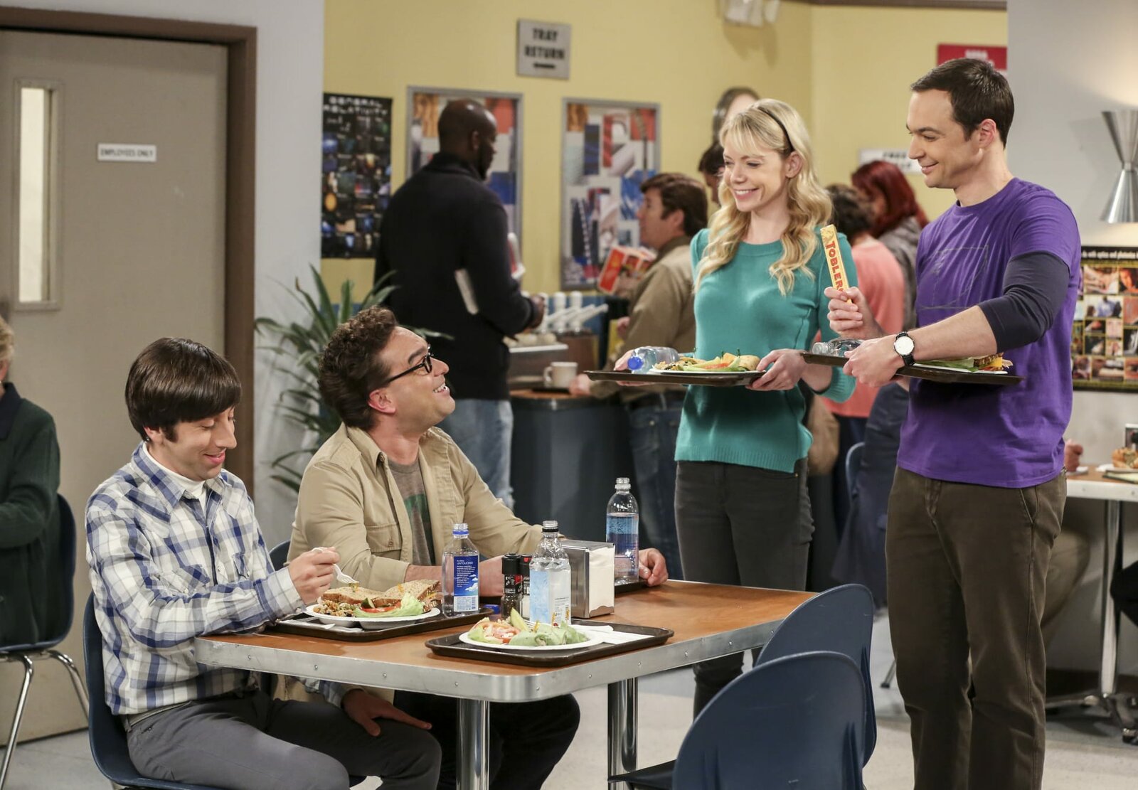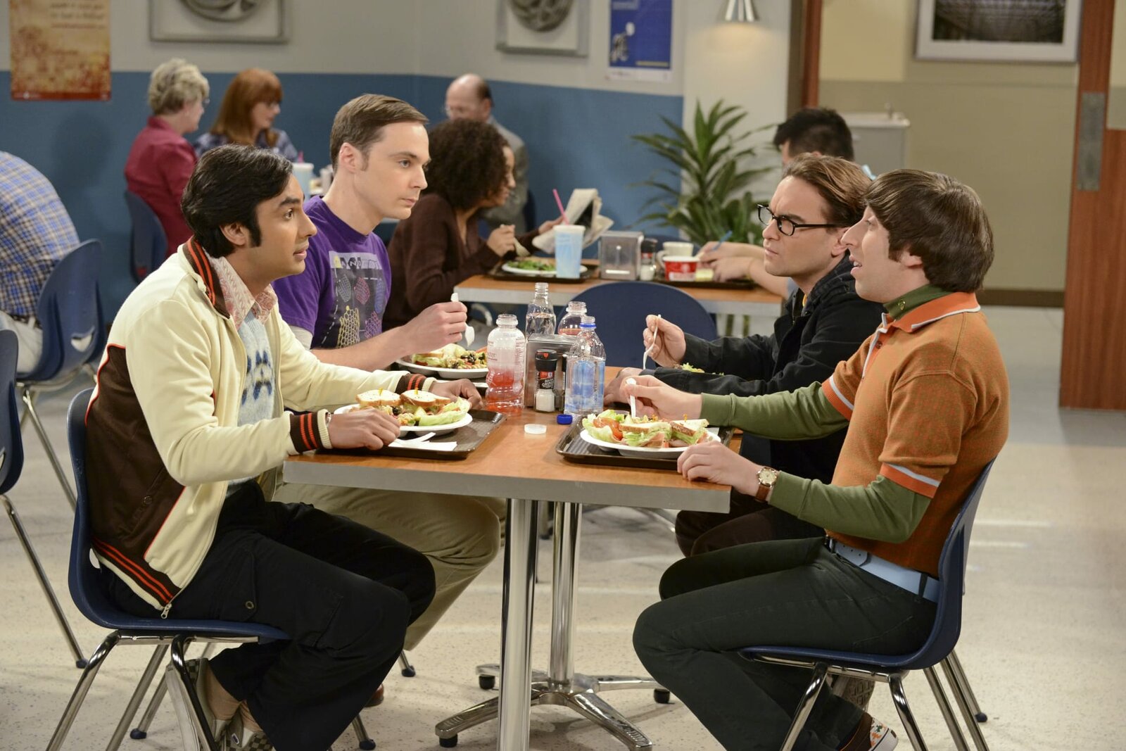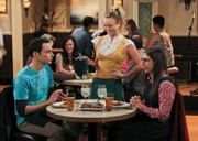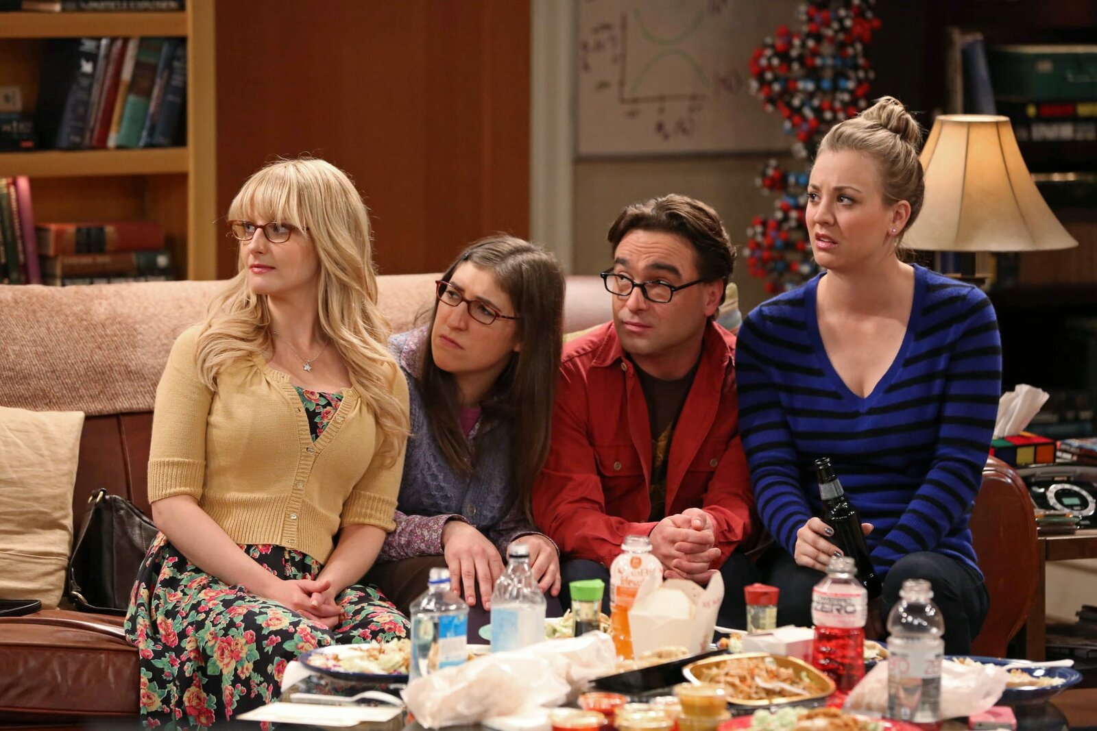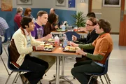 Ehevollzug!Als Amy mit Sheldon (Jim Parsons, 2.v.r.) Schluss macht, ist dieser sichtlich geschockt. Bernadette (Melissa Rauch, l.), Howard (Simon Helberg, 2.v.l.) und Stuart (Kevin Sussman, r.) sind wenig überrascht ...Bild: © GLEN