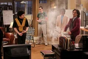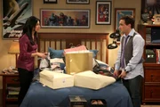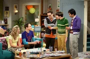 Business im WohnzimmerLeonard (Johnny Galecki, M.) hat für Pennys (Kaley Cuoco, l.) neues Unternehmen eine Webseite gebastelt. Dummerweise dort auch die Möglichkeit einer Expresslieferung eingerichtet, so dass sie nun gemeinsam mit Sheldon (Jim Parsons, 2.v.l.), Rajesh (Kunal Nayyar, r.) und Howard (Simon Helberg, 2.v.r.) über Nacht 1.000 Penny-Blütenträume herstellen und ausliefern müssen. Eine harte Aufgabe ...Bild: © Turner / © Warner Bros. Entertainment Inc.