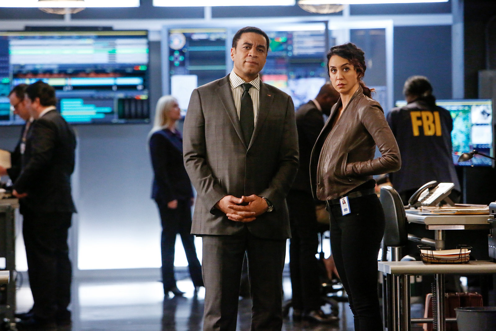 Mr. Solomon (Nr. 32) (1)V.l.: Samar Navabi (Mozhan Marnň), Harold Cooper (Harry Lennix), Tom (Ryan Eggold), Liz (Megan Boone, Rückansicht), Aram Mojtabai (Amir Arison)Bild: © RTL Crime / Sony Televisio