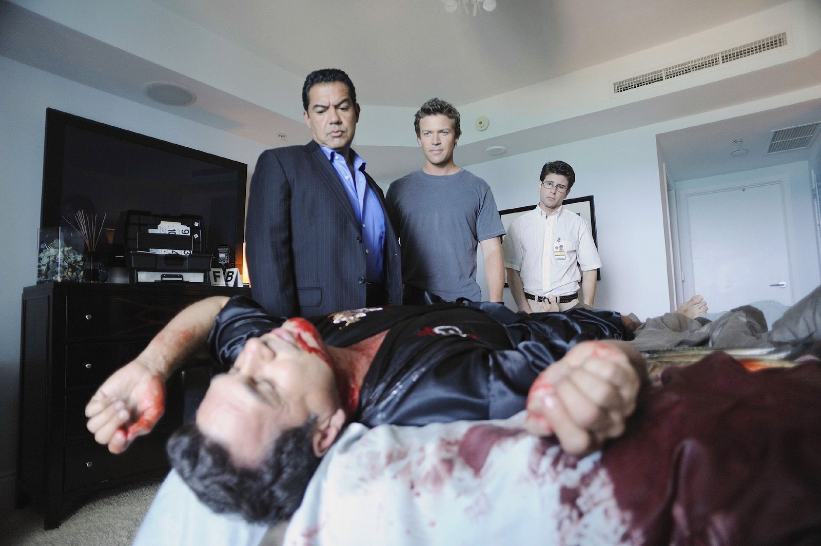 Die dunkle Seite der LeidenschaftSenator Chapman (Scott Cohen) wird von Jim und Carlos zum Tod seiner Geliebten befragt.Bild: © RTL Crime