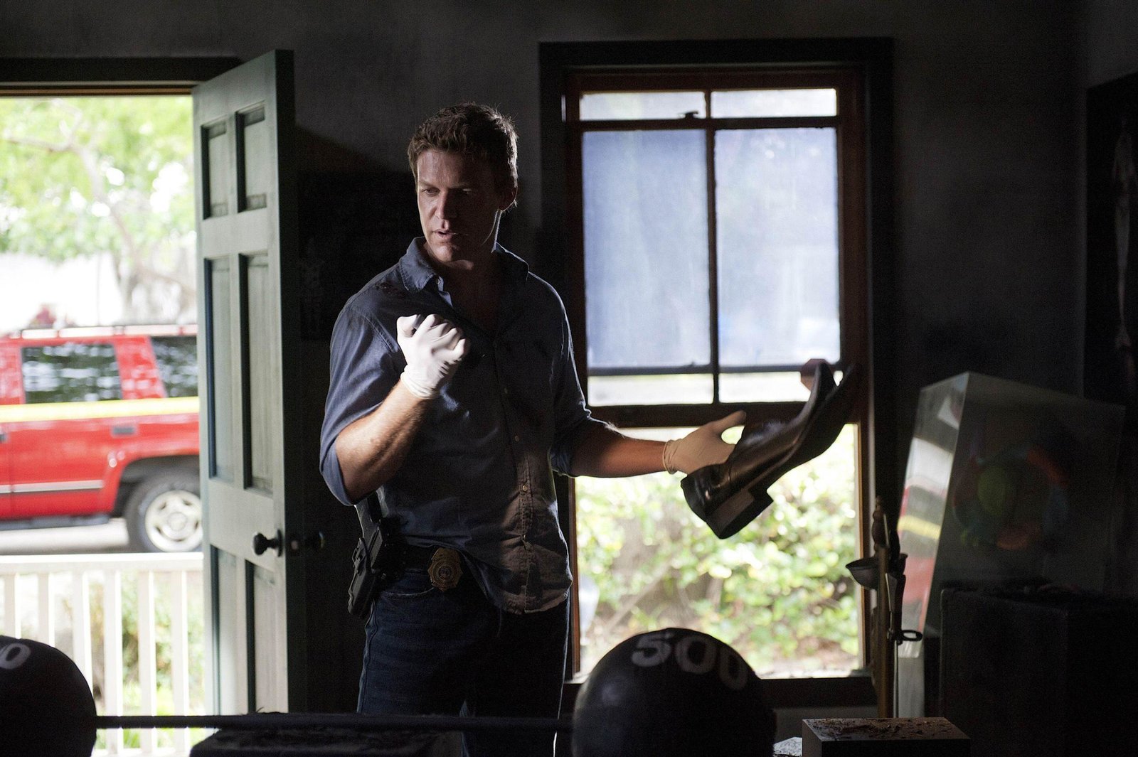 Reptilien im ParadiesDetective Jim Longworth (Matt Passmore) findet den Kaiman, der den Kopf der Leiche gefressen hat und erschießt das Tier, um den Mageninhalt untersuchen zu lassen.Bild: © TVNOW / Reptilien im Paradies