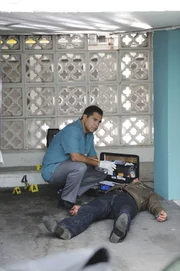 So stirbt kein GentlemanCarlos (Carlos Gomez) untersucht in der Nähe einer Strandbar eine männliche Leiche, auf die geschossen und eingestochen wurde und an der sich überdies Giftspuren befinden. Was davon ist aber die Todesursache?Bild: © Super RTL