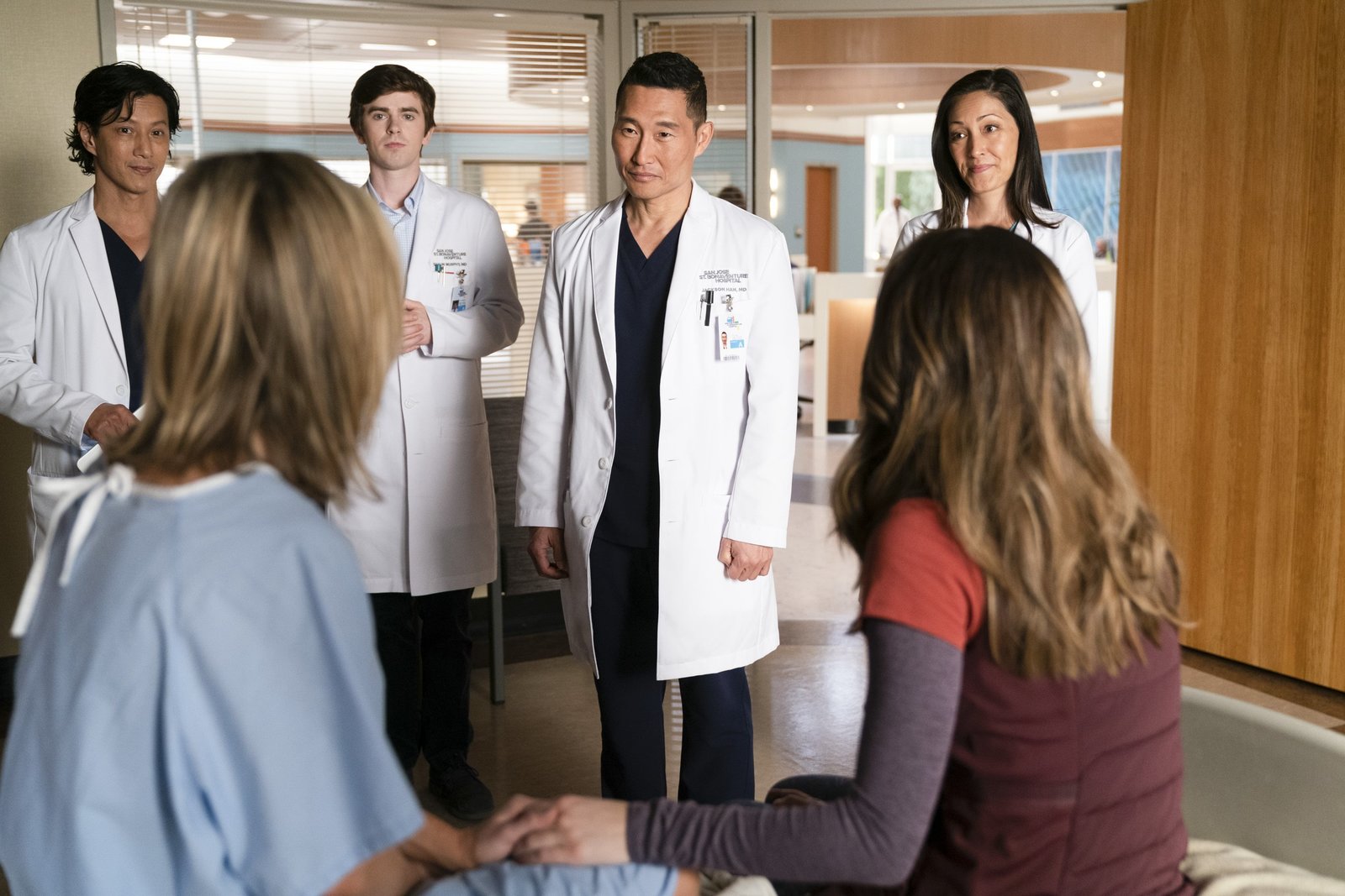 Auszeitv.h.l.: Dr. Alex Park (Will Yun Lee), Dr. Shaun Murphy (Freddie Highmore), Dr. Jackson Han (Daniel Dae Kim), Dr. Audrey Lim (Christina Chang) und v.v.l.: Pastor Clarence's Wife (Diana Pavlovská) und Jess Barnes (Natasha Calis)Bild: © David Bukach / David Bukach/ABC/Courtesy of Sony Pictures Television / American Broadcasting Companies, Inc. / © 2019 American Broadcasting Companies, Inc. All rights reserved.