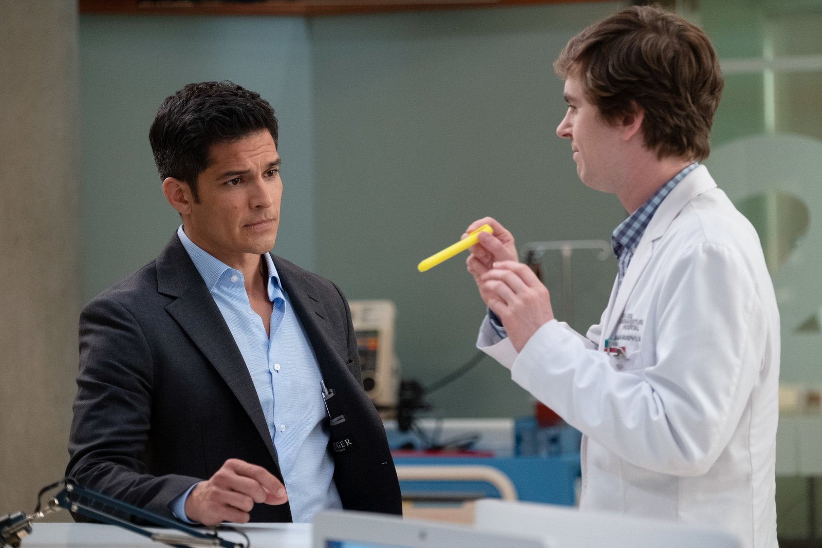 Die zwei Seiten der Wahrheit"The Good Doctor", "Die zwei Seiten der Wahrheit." Shaun bemerkt beim Klinikhausmeister Paul Symptome eines Pankreas-Karzinoms. Da Shaun nicht lügen kann, teil er Paul seine Vermutung mit, obwohl die Diagnose noch keineswegs gesichert ist. Doch die anschließenden Labourtest bestätigen Shauns Verdacht. Nun muss Paul eine schwerwiegende Entscheidung fällen. Mittlerweile ist Dr. Glassman auf der Suche nach einem Chirurgen, den er für fähig genug hält, seinen Gehirntumor zu operieren.Im Bild (v.li.): Nicholas Gonzalez (Dr. Neil Melendez), Freddie Highmore (Dr. Shaun Murphy).Bild: © ORF 1