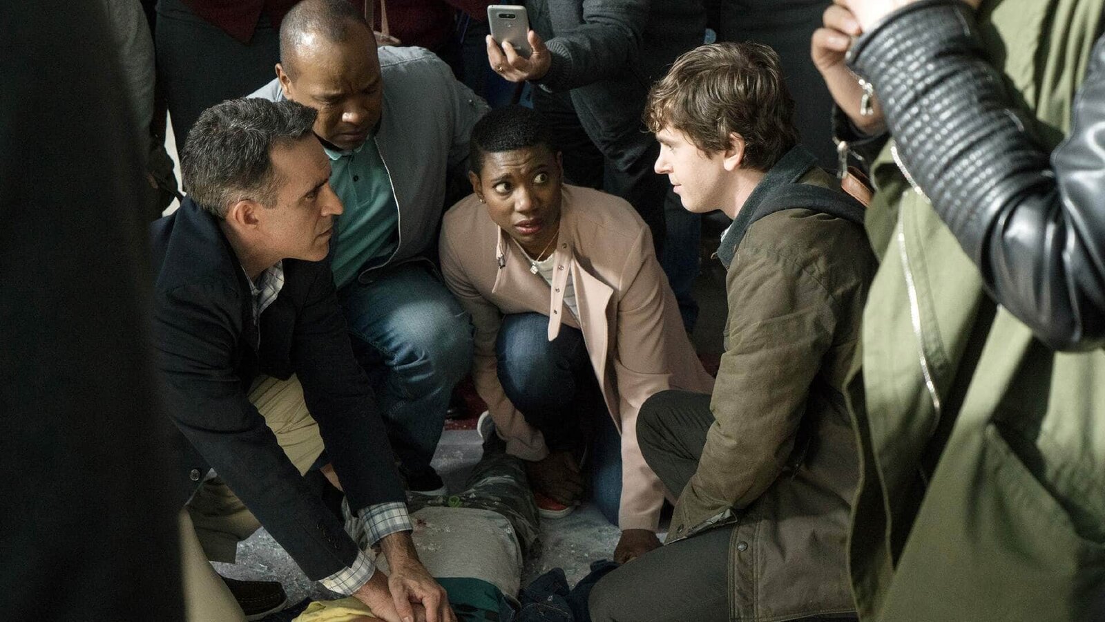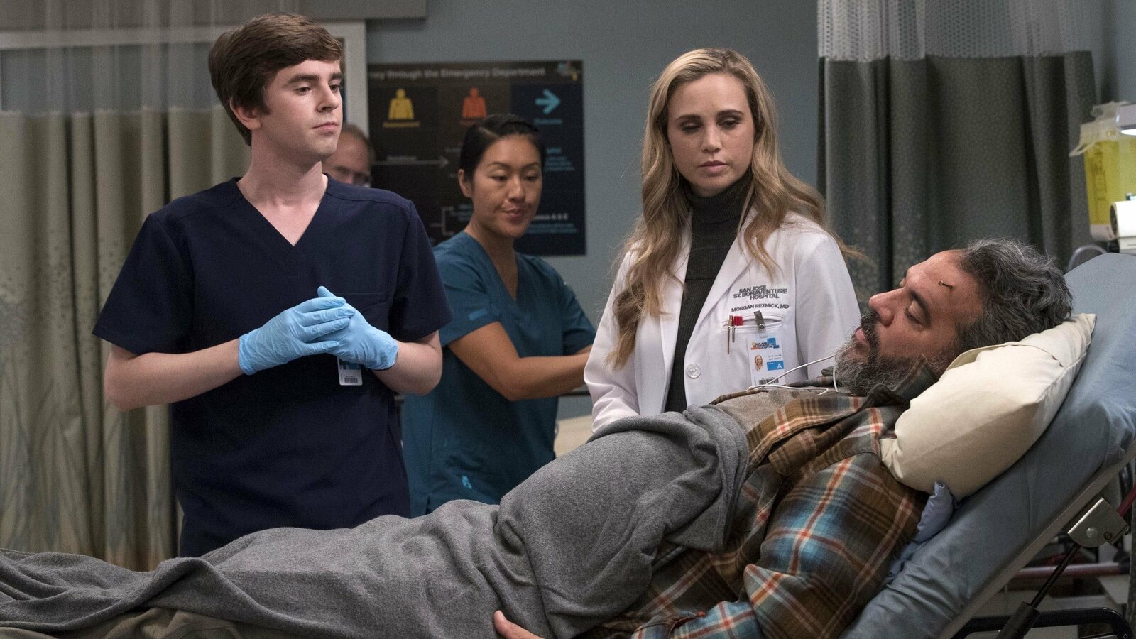 Ein außergewöhnliches TalentV.l.: Arzt (Sam Vincent), Adam (Orlando Lucas, liegend), Carl (Matthew Mandzij), Bonnie (Miranda Edwards), Dr. Shaun Murphy (Freddie Highmore)Bild: © MG RTL D / © 2017 Sony Pictures Television Inc