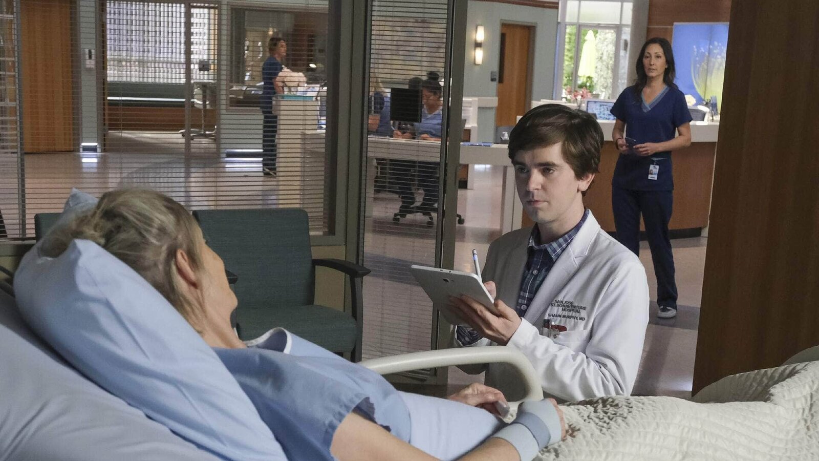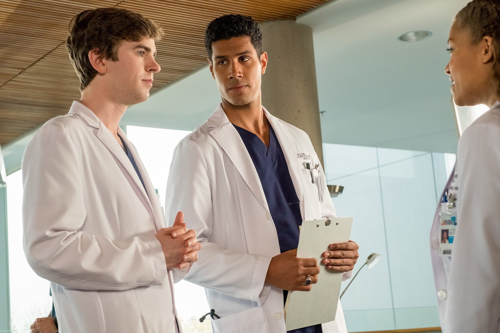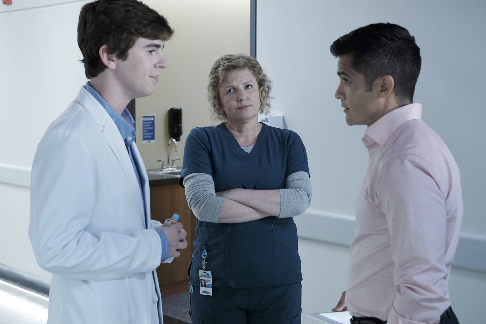 Fremde FedernDr. Shaun Murphy (Freddie Highmore, l.), Krankenschwester Fryday (Eve Gordon), Dr. Neil Melendez (Nicholas Gonzalez)Bild: © MG RTL D / © 2017 Sony Pictures Television Inc. and Disney Enterprises, Inc. All Rights Reserved.
