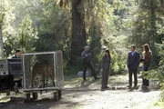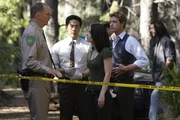Die Axt im WaldeAls der Schüler eines Waldinternats tot aufgefunden wird, werden Patrick Jane (Simon Baker, 2.v.l.) und seine Kollegen Wayne (Owain Yeoman, l.), Teresa (Robin Tunney, 2.v.r.) und Grace (Amanda Righetti, r.) zum Fundort gerufen ...Bild: © Warner Bros. Television Lizenzbild frei