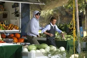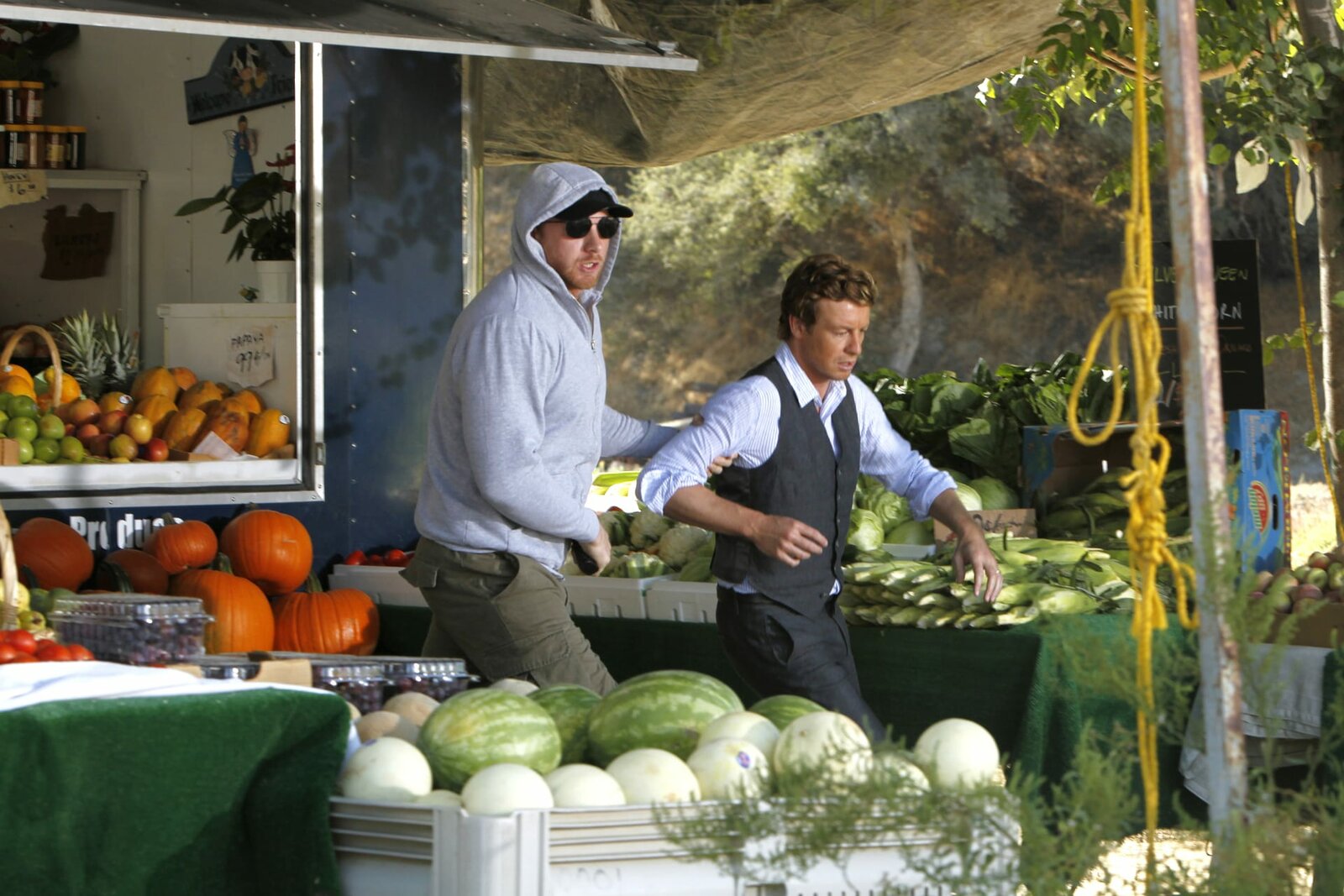 Von langer HandPatrick Jane (Simon Baker, r.) wird an einem Obststand vom Gangster Fred Kittel (Adam Dunnells, l.) entführt, nachdem dieser den Obsthändler erschossen hat. Das CBI ist auf einen Notruf hin, den Patrick noch absetzen konnte, bald zur Stelle und verhört die Zeugen ...Bild: © Warner Bros. Television Lizenzbild frei