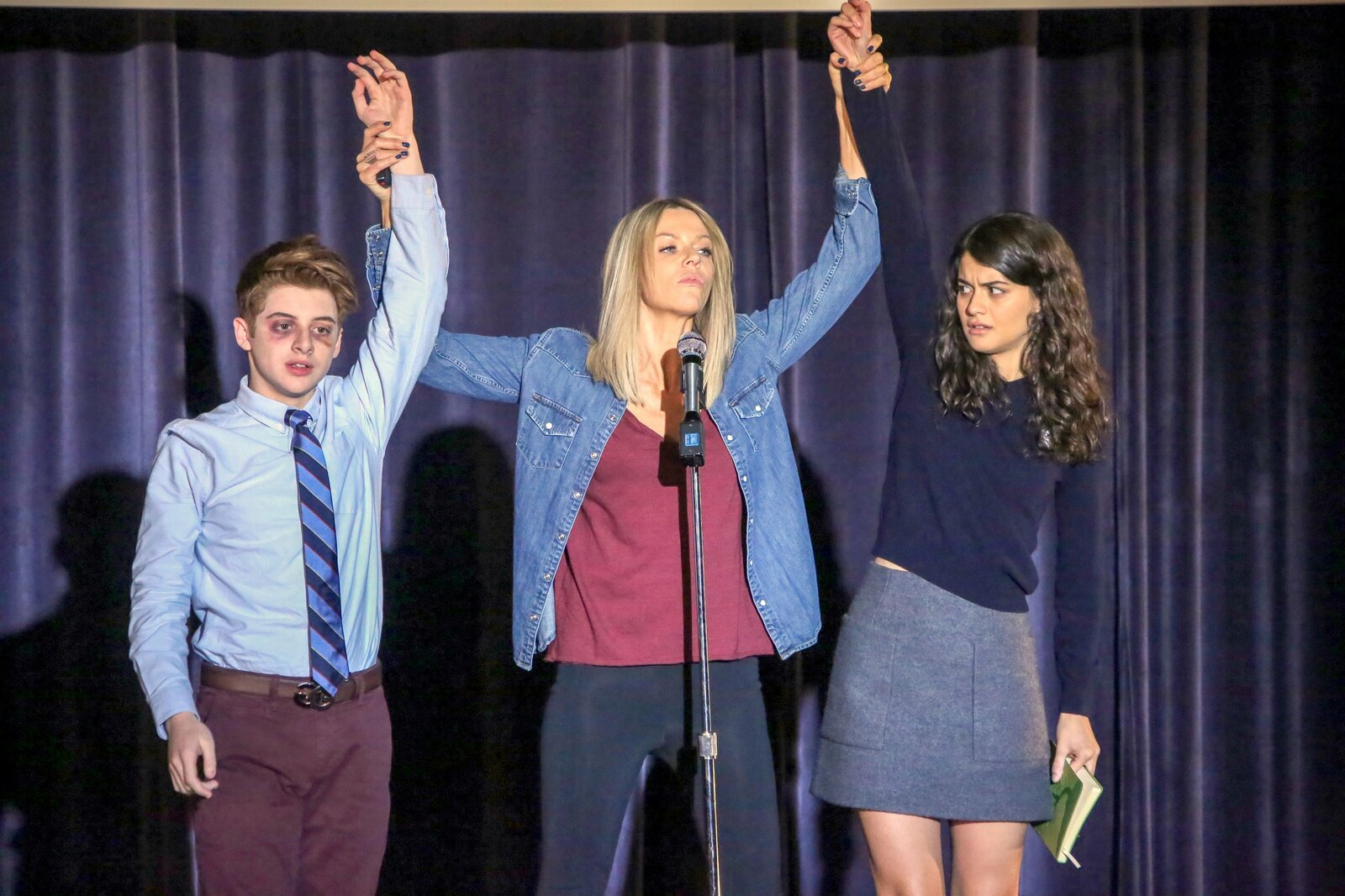 Der LehrerChip (Thomas Barbusca, l.) und Sabrina (Sofia Black-D'Elia, r.) landen unfreiwillig mit ihrer Tante (Kaitlin Olson, M.) auf der Bühne eines Wettbewerbs an ihrer Schule.Bild: © ORF 1