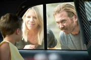 Mick (Kaitlin Olson, M.) und Jimmy (Scott Mac Arthur, r.) haben ihren Ziehsohn Ben (Jack Stanton, l.) versehentlich in ein altes Polizeiauto gesperrt.Bild: © ORF/Pro7/FOX/Patrick McElhenney