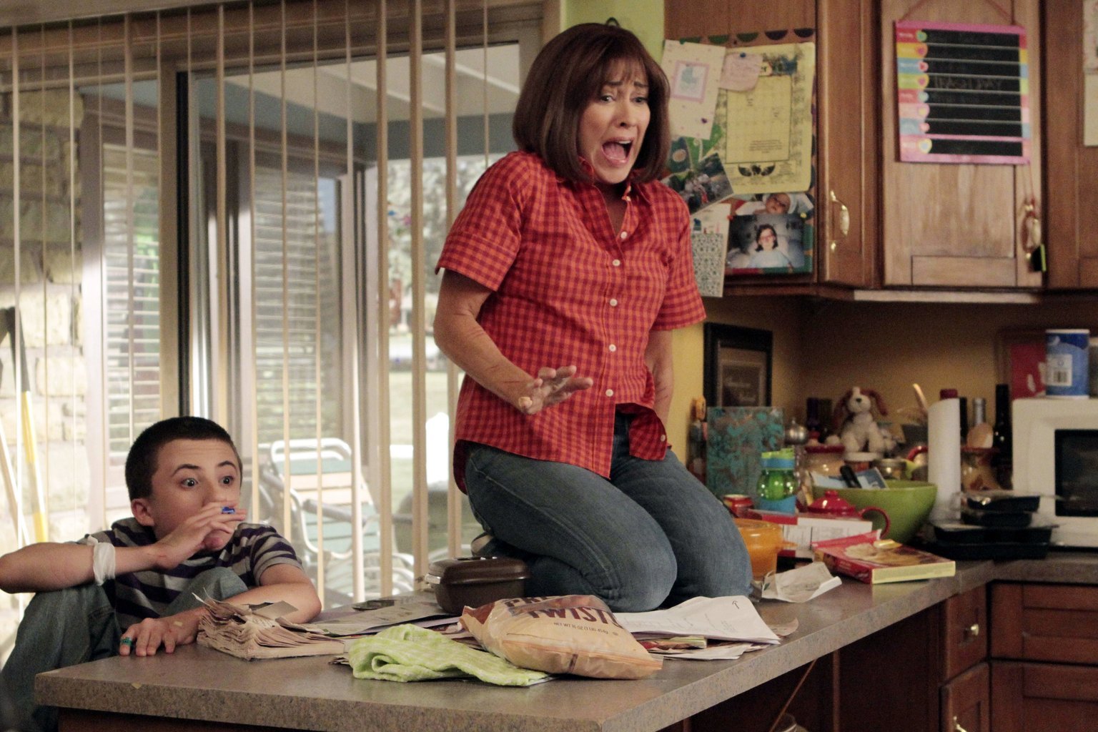 Der neue TickWeil der Therapeut Frankie (Patricia Heaton, r.) und Mike rät, für Brick (Atticus Shaffer, l.) ein Haustier anzuschaffen, damit er soziales Verhalten lernt, holen die beiden einen Hasen ins Haus. Eine Entscheidung, die sie schnell bereuen ...Bild: © Warner Brothers Lizenzbild frei