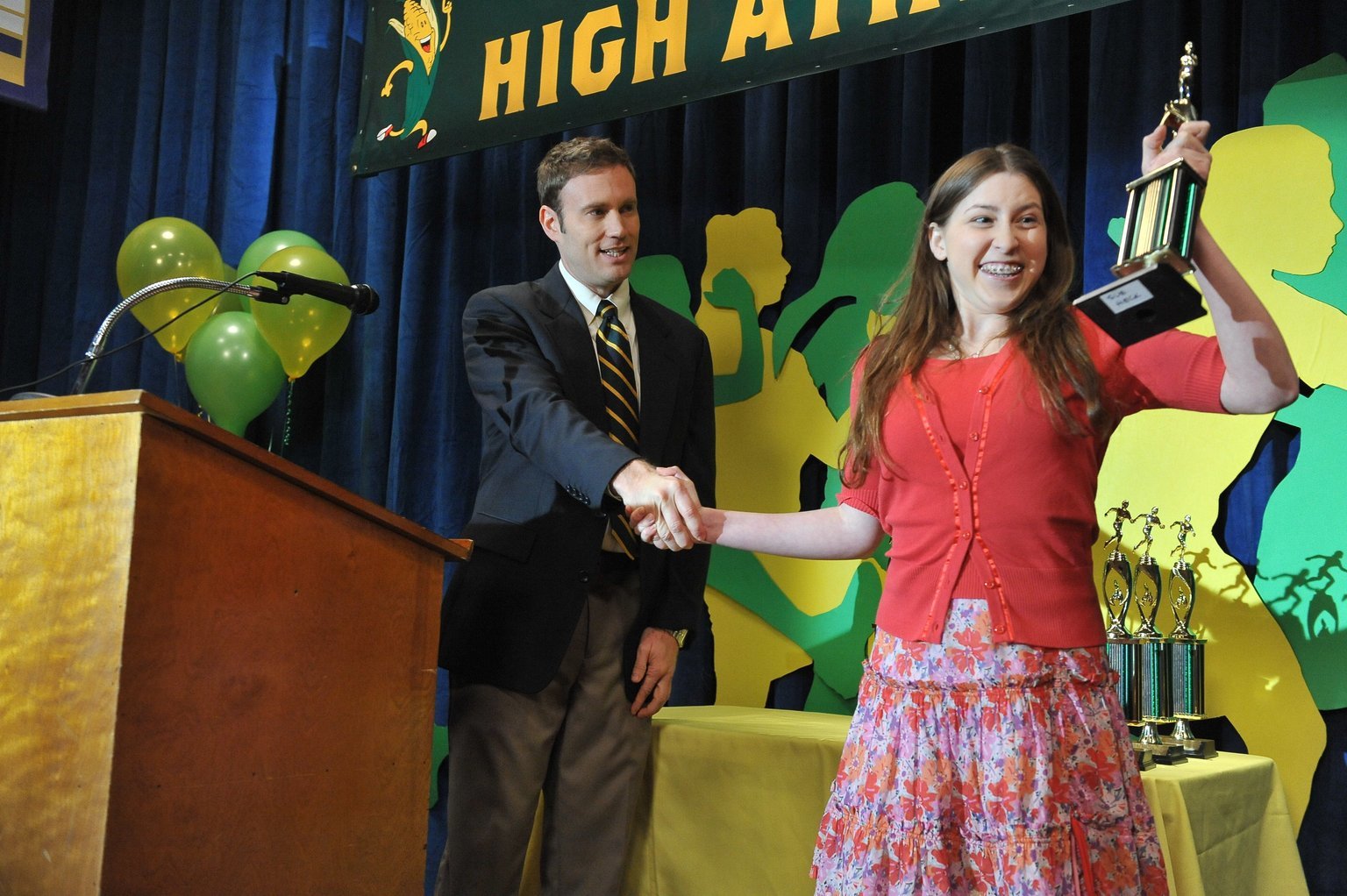 Das VermächtnisWird Sue (Eden Sher, l.) endlich zur Gewinnerin? Coach Emerson (Greg Cromer, r.) händigt ihr eine Trophäe für ihre Leistungen im Langstreckenlauf aus. Allerdings soll die Geld dafür bezahlen ...Bild: © Warner Brothers Lizenzbild frei