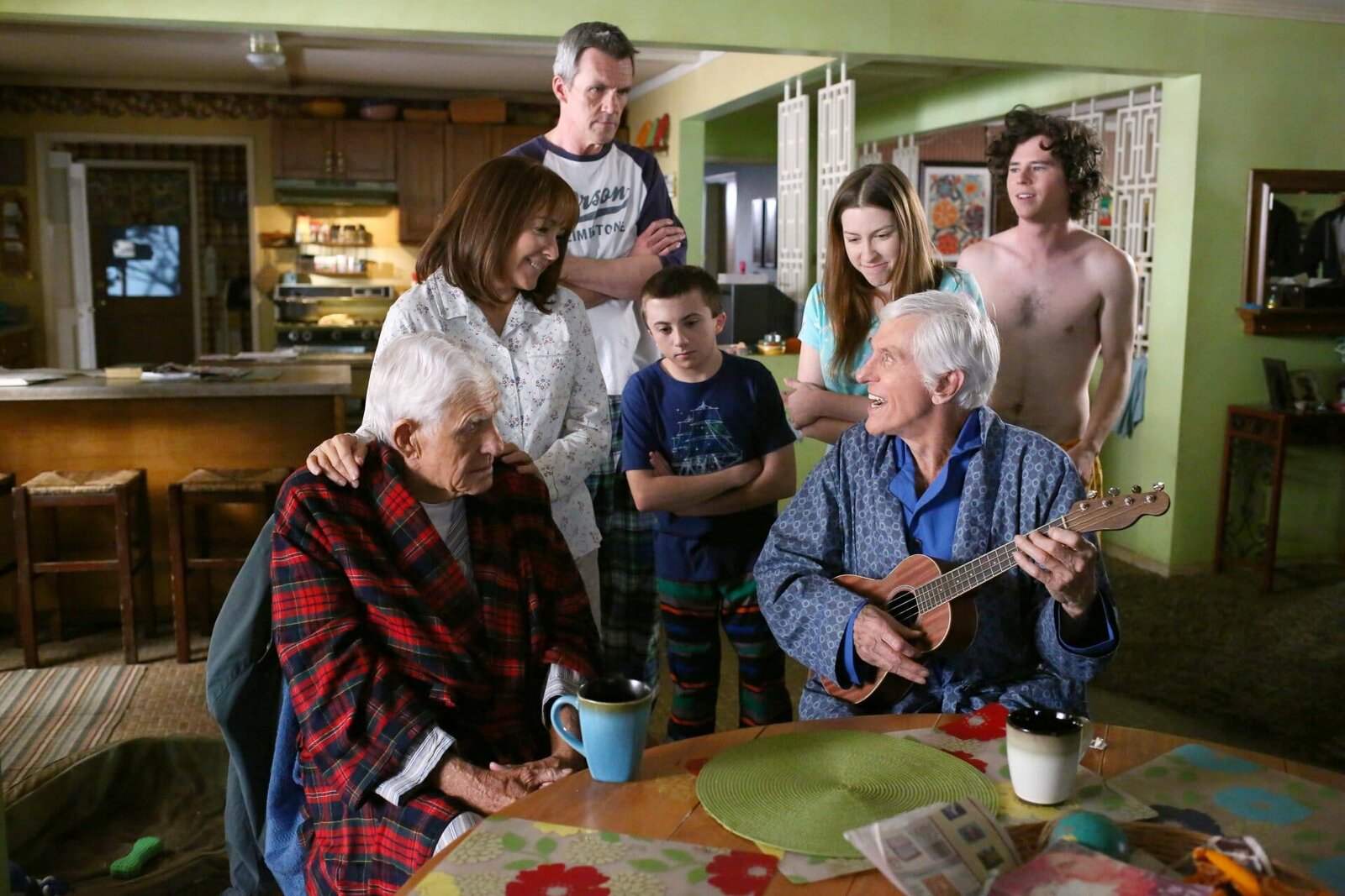 Der Heilungsprozess(v.l.n.r.) Tag (Jerry Van Dyke); Frankie (Patricia Heaton); Mike (Neil Flynn); Brick (Atticus Shaffer); Sue (Eden Sher); Dutch (Dick Van Dyke); Axl (Charlie McDermott)Bild: © Warner Brothers Lizenzbild frei