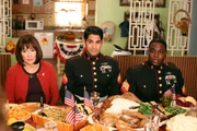 Die WunderheilungWeil Frankie (Patricia Heaton, l.) an Thanksgiving eine gute Tat vollbringen möchte, lädt sie die zwei Marinesoldaten Nick Martinez (Will F. Vasquez, M.) und Justin Howard (Nick Jones Jr., r.) zum Dinner ein. Doch dank Frankies Eltern droht das Essen zum Desaster zu werden ...Bild: © Warner Brothers Lizenzbild frei