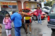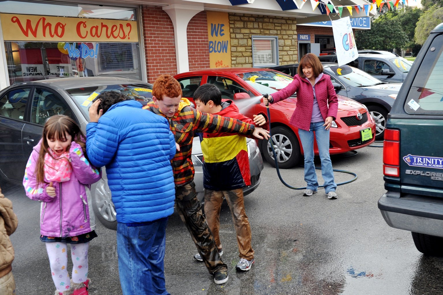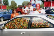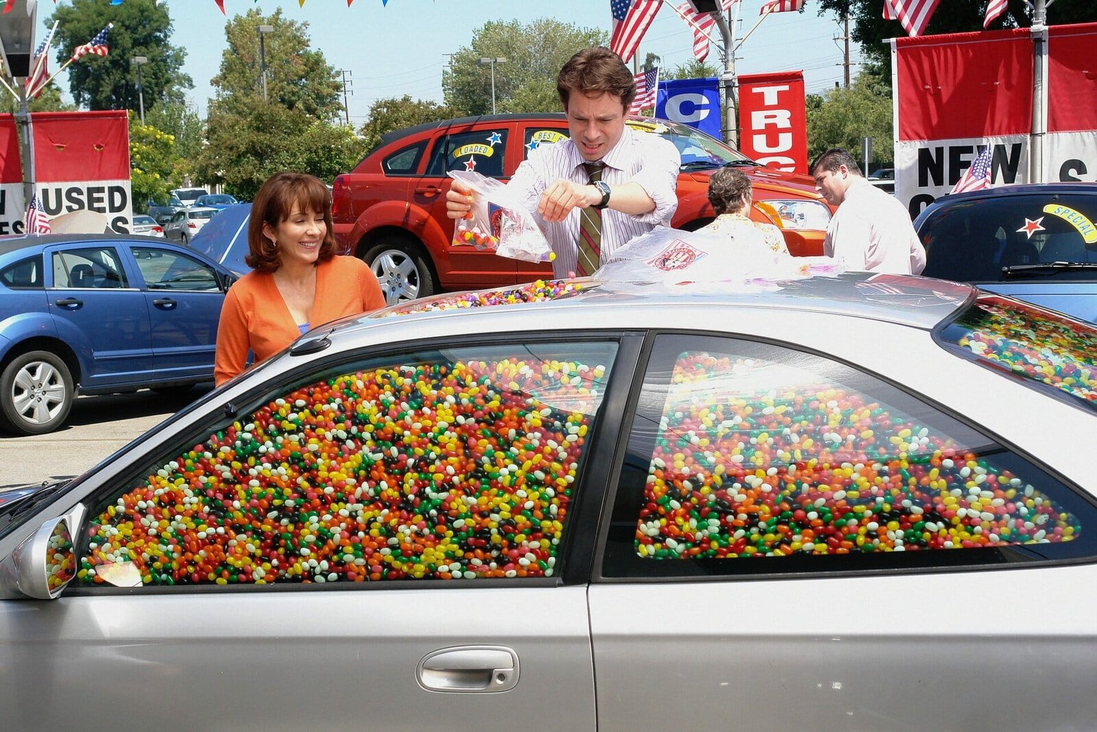 Das SchwimmteamUm ihren Job zu retten, kommt Frankie (Patricia Heaton, l.) eine tolle Marketing-Idee. Sie füllt gemeinsam mit Bob (Chris Kattan, r.) einen der angebotenen Gebrauchtwagen mit Jelly Beans. In einer großen Verlosung sollen die Teilnehmer der Verlosung raten, wie viele Jelly Beans in dem Auto sind ...Bild: © Warner Brothers Lizenzbild frei