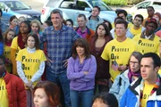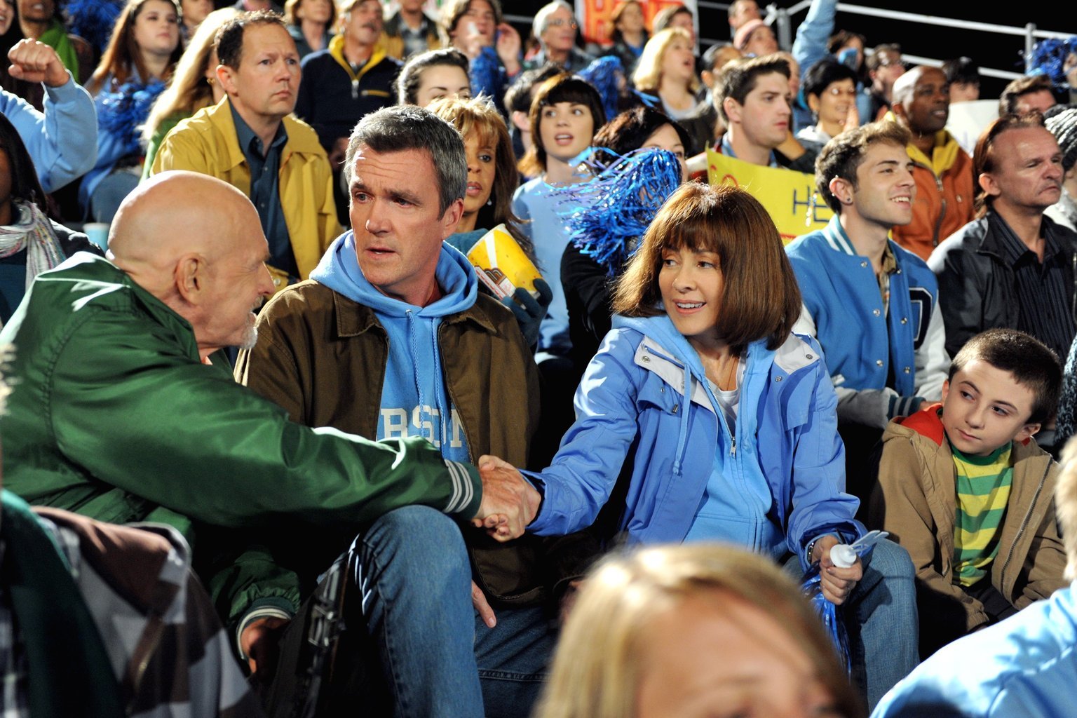 Der TestWährend Mike (Neil Flynn, mittlere Reihe 2.v.l.), Frankie (Patricia Heaton, mittlere Reihe 2.v.r.) und Brick (Atticus Shaffer, mittlere Reihe r.) Sues peinlichen Cheerleader-Auftritt beobachten, überrascht ein gewisser Jack Tracy (Casey Sander, mittlere Reihe l.) sie mit einer sensationellen Neuigkeit ...Bild: © Warner Brothers Lizenzbild frei