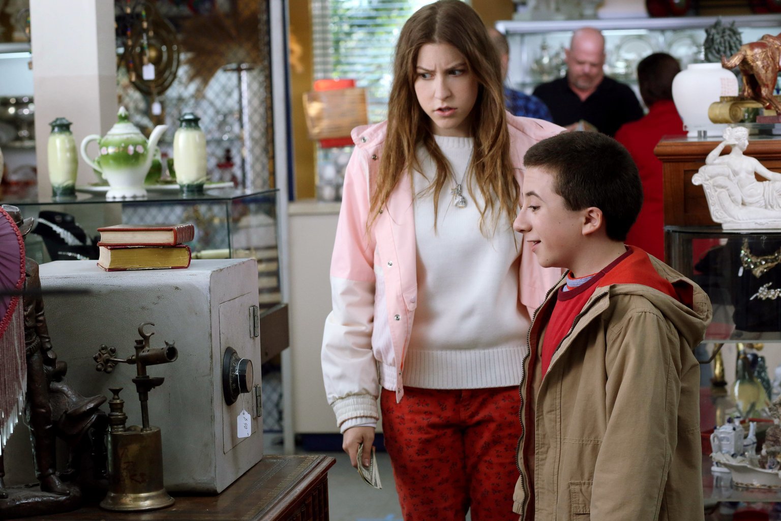 Der SafeSue (Eden Sher, l.) und Brick (Atticus Shaffer, r.) wollen beim Pfandleiher einen alten Safe kaufen, in der Hoffnung, darin eine Menge Geld zu finden. In der Zwischenzeit entwickelt Axl Gefühle für seine Nachhilfelehrerin Cassidy ...Bild: © Warner Brothers Lizenzbild frei