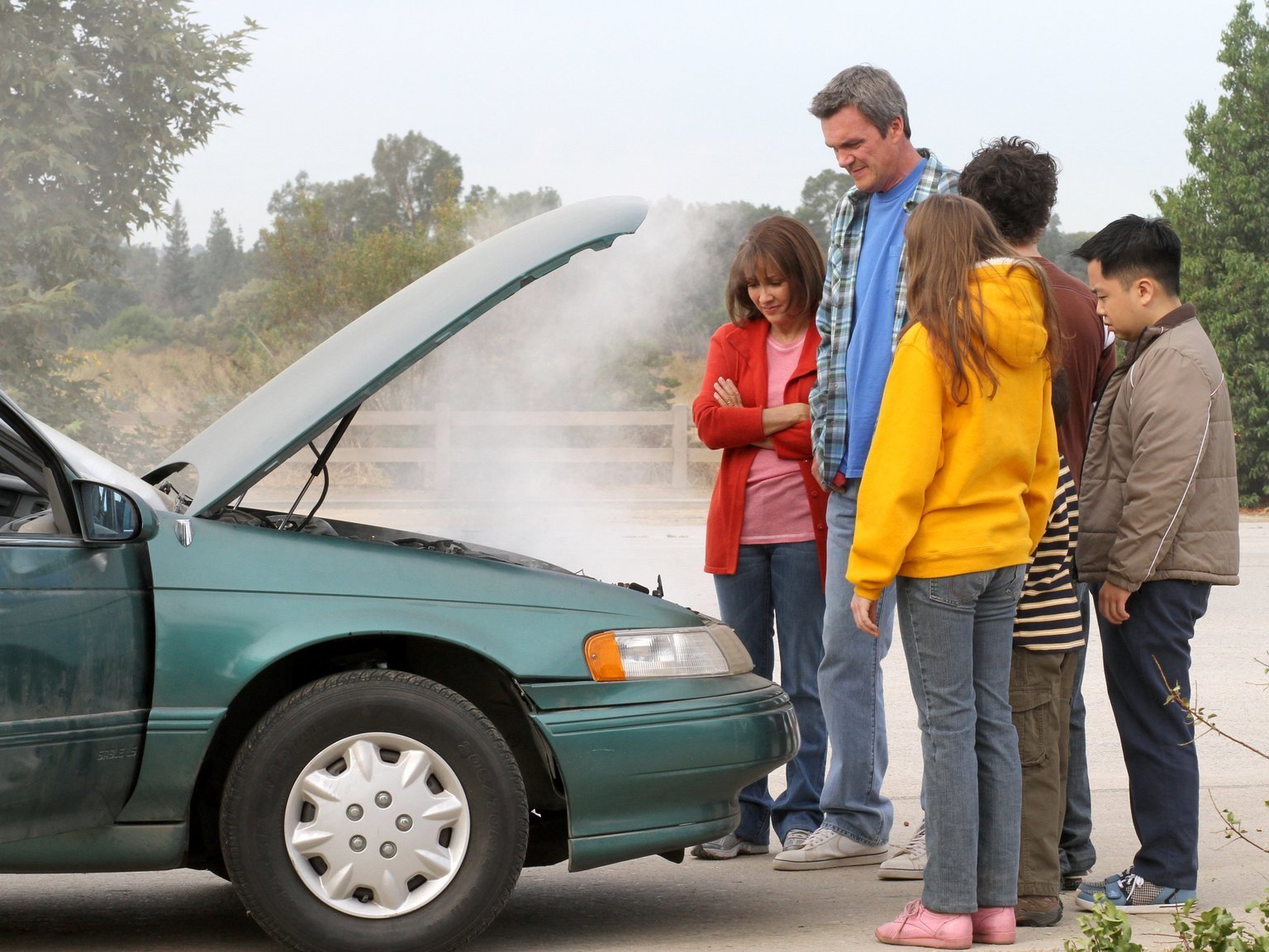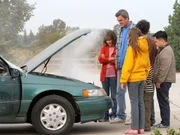 Der AustauschschülerAls Frankie (Patricia Heaton, l.), Mike (Neil Flynn, 2.v.l.), Sue (Eden Sher, 3v.l.) und Axl (Charlie McDermott, 2.v.r.) den japanischen Austauschstudenten Takayuki (Matthew Moy, r.) bei sich aufnehmen, wollen sie ihm mit einem gemeinsamen Ausflug imponieren, doch als das Auto eine Panne hat, bricht Chaos aus ...Bild: © Warner Brothers Lizenzbild frei