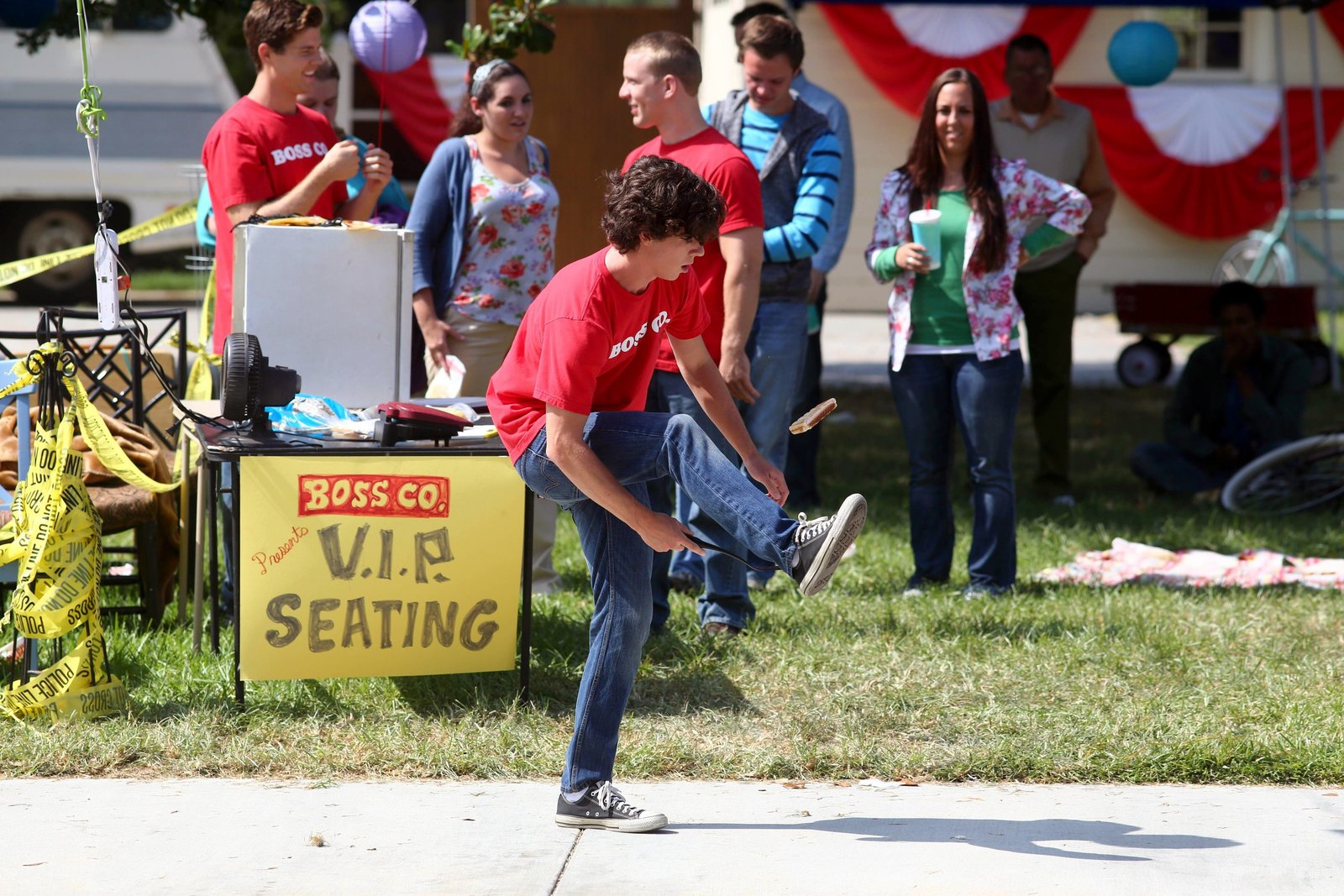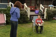 Der Tag der GeständnisseWährend Brick (Atticus Shaffer, l.) noch mit seinem Essen ringt, ringen Marlene (Mary Birdsong, r.) und Dr. Ted Goodwin (Jack McBrayer, m.) auf dem Rasen.Bild: © Warner Brothers Lizenzbild frei