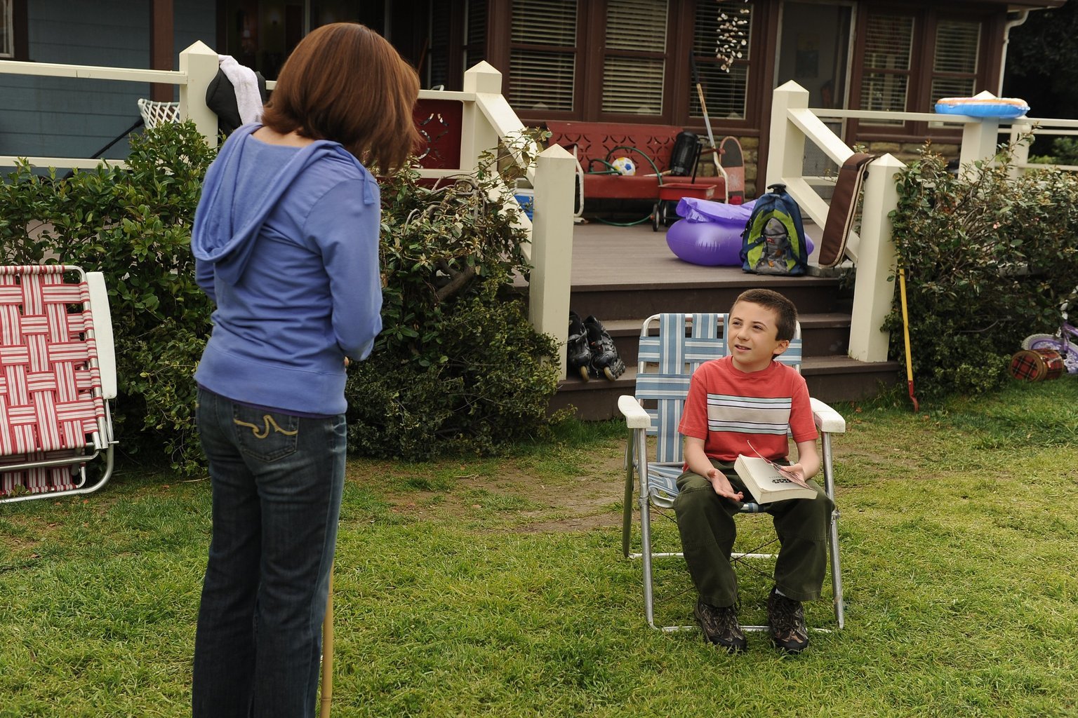 Die SommerferienBrick (Atticus Shaffer, r.) hätte das ganze Schuljahr lang Tagebuch führen müssen, über alles was er erlebt hat. Jetzt, da der Abgabetermin näher rückt, müssen sich er und Frankie (Patricia Heaton, l.) schnell irgendwelche Aktivitäten einfallen lassen, mit denen sie das Buch füllen können ...Bild: © Warner Brothers Lizenzbild frei