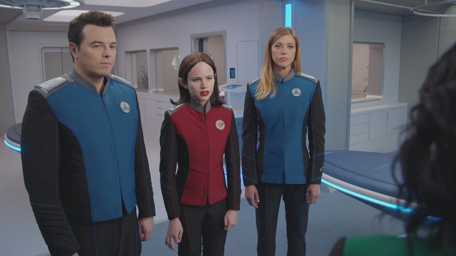 Zu Hause(v.l.n.r.) Captain Ed Mercer (Seth MacFarlane); Lieutenant Alara Kitan (Halston Sage); Commander Kelly Grayson (Adrianne Palicki)Bild: © 2019 Twentieth Century Fox Film Corporation. All rights reserved. Lizenzbild frei