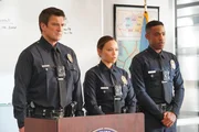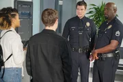 100 Tage RookieJohn Nolan (Nathan Fillion, l.), Lucy Chen (Melissa O'Neil, 2.v.l.) und Jackson West (Titus Makin Jr., r.) feiern ihr einhunderttägiges Jubiläum beim Department.Bild: © ZDF und Rick Rowell.