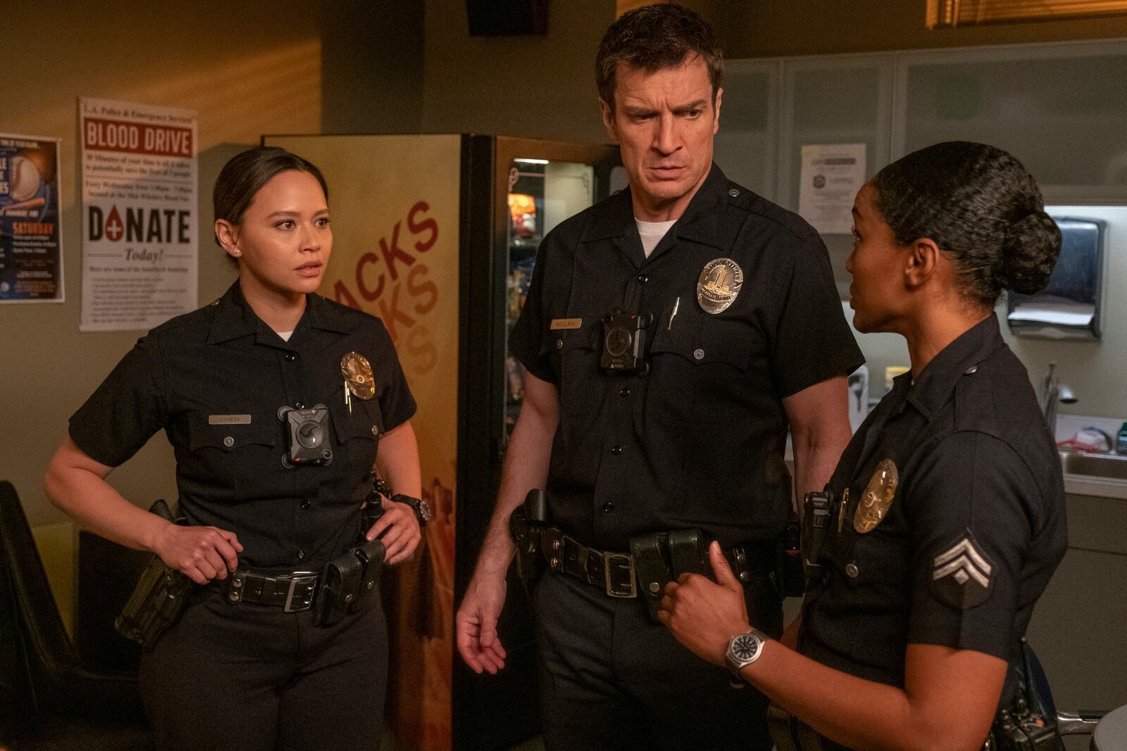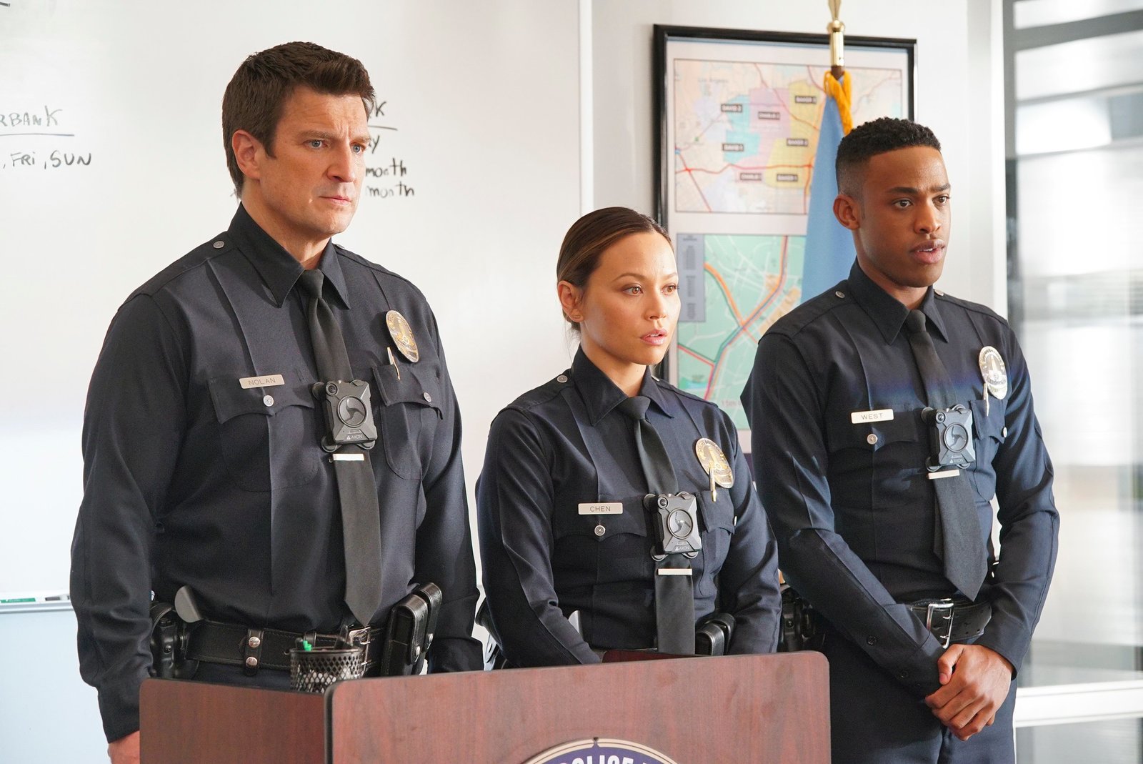 RedwoodJohn Nolan (Nathan Fillion, l.), Lucy Chen (Melissa O'Neil, 2.v.l.) und Jackson West (Jackson West, r.) nehmen an der Einsatzbesprechung teilBild: © ZDF und Eric McCandless./Eric McCandless